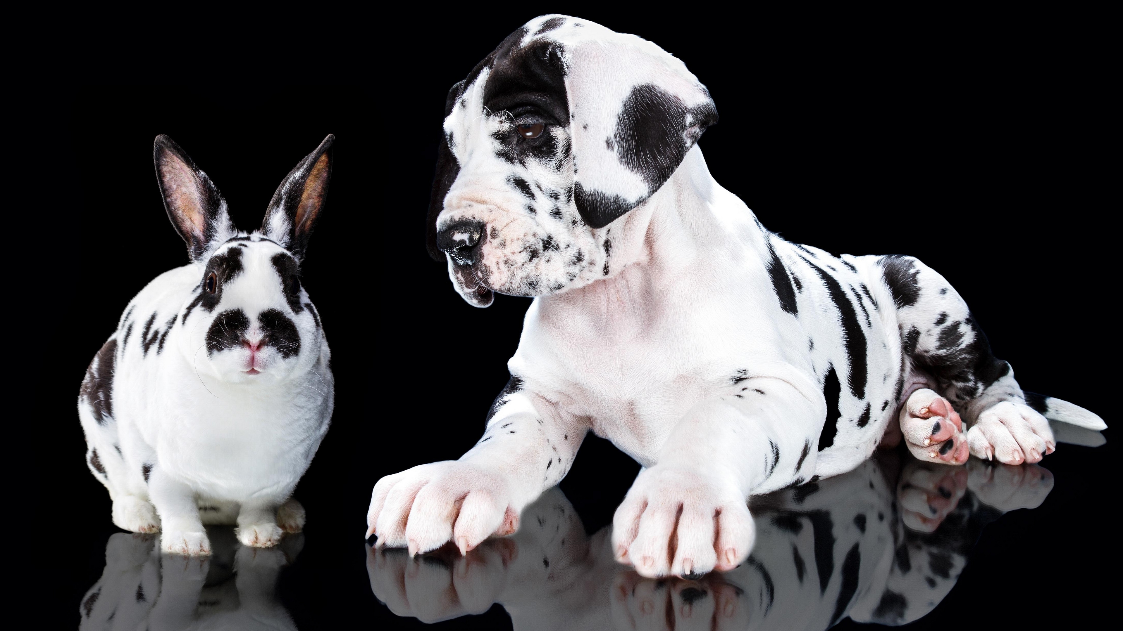 Description: A dog and a rabbit are sitting side by side on a reflective surface.
