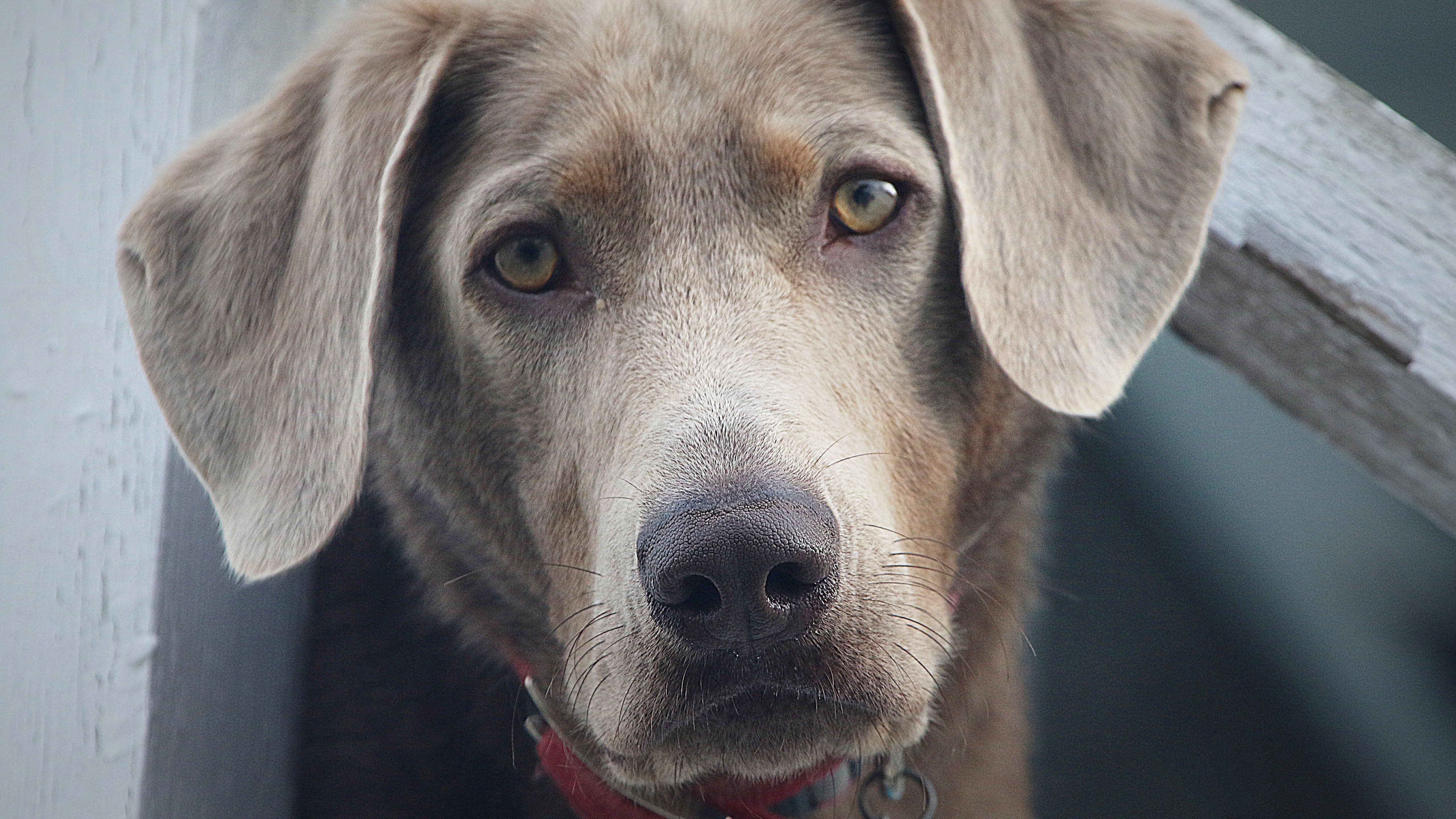 Description: A dog with a red collar looking out a window with a sad look on his face and nose.