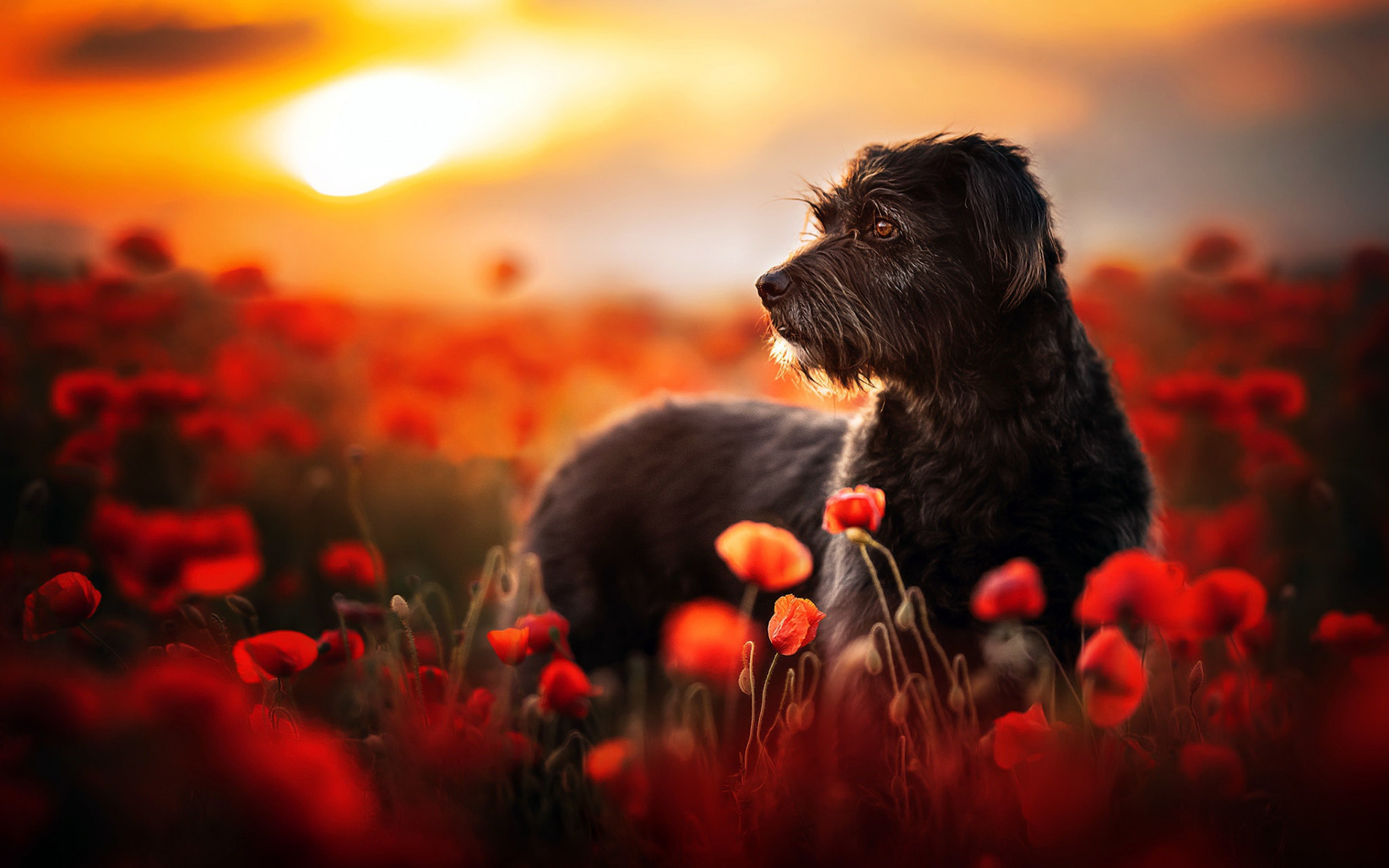 Description: A dog standing in a field of red flowers at sunset with the sun in the background and a cloudy sky.