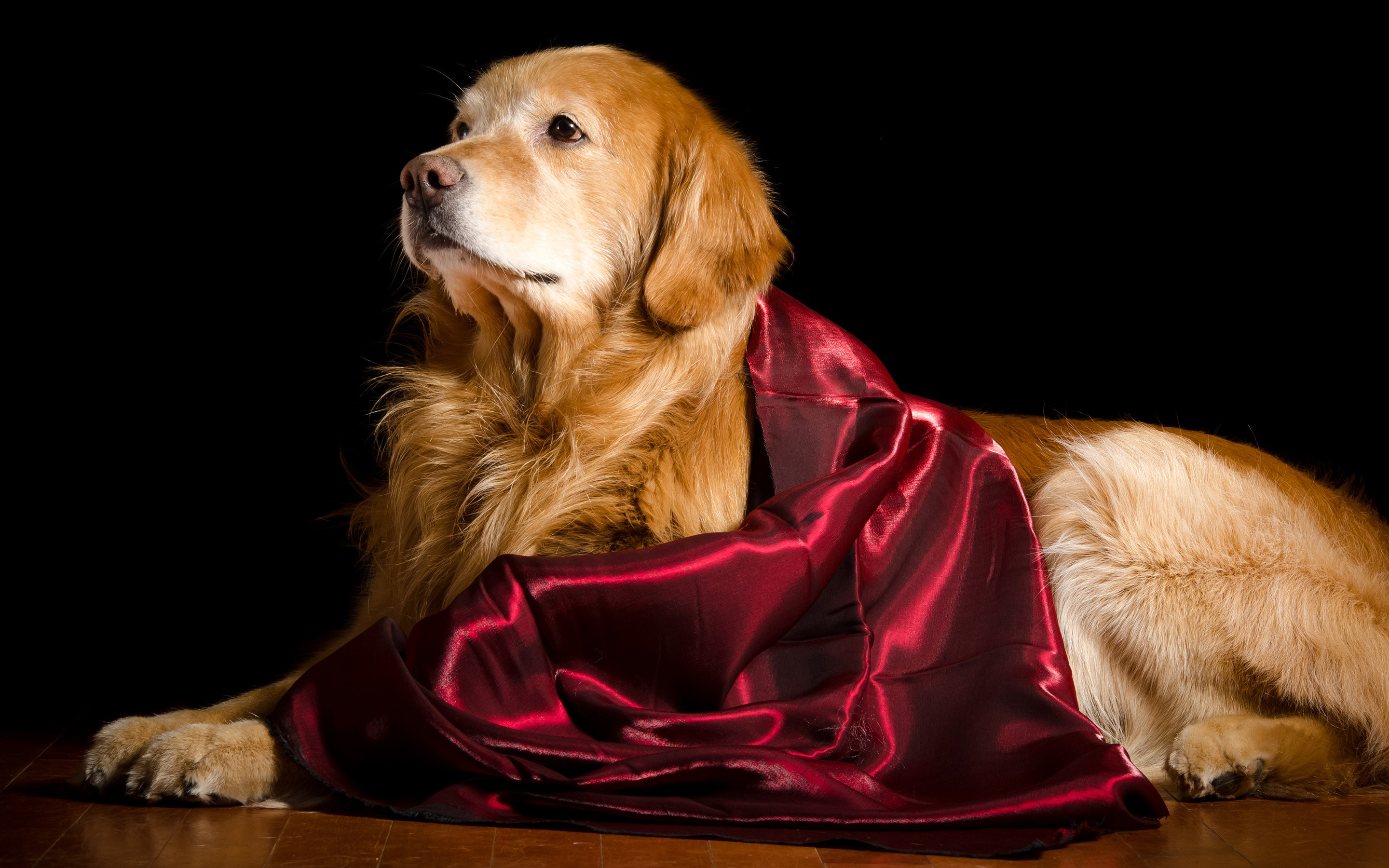 Description: A dog wearing a red cape laying on a wooden floor in the dark with a black background and a black backdrop.