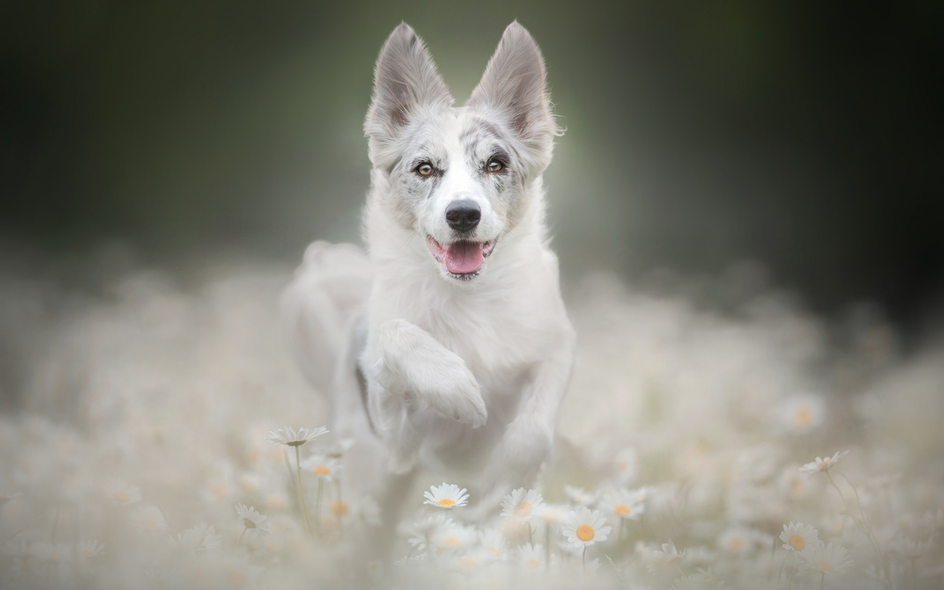 Description: A dog running through a field of daisies with its mouth open and tongue out.