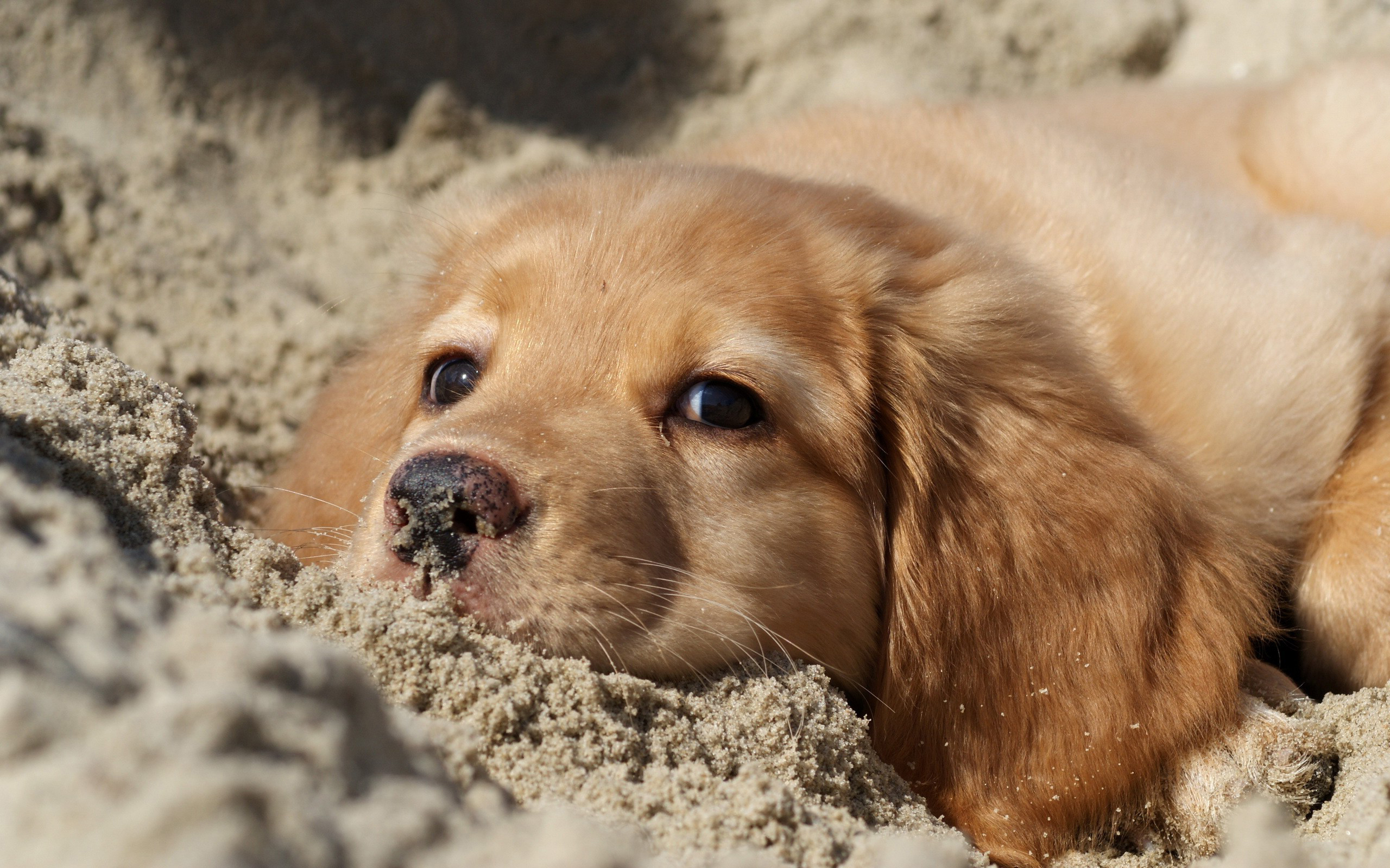 Description: A dog laying in the sand with his head sticking out of the sand hole.