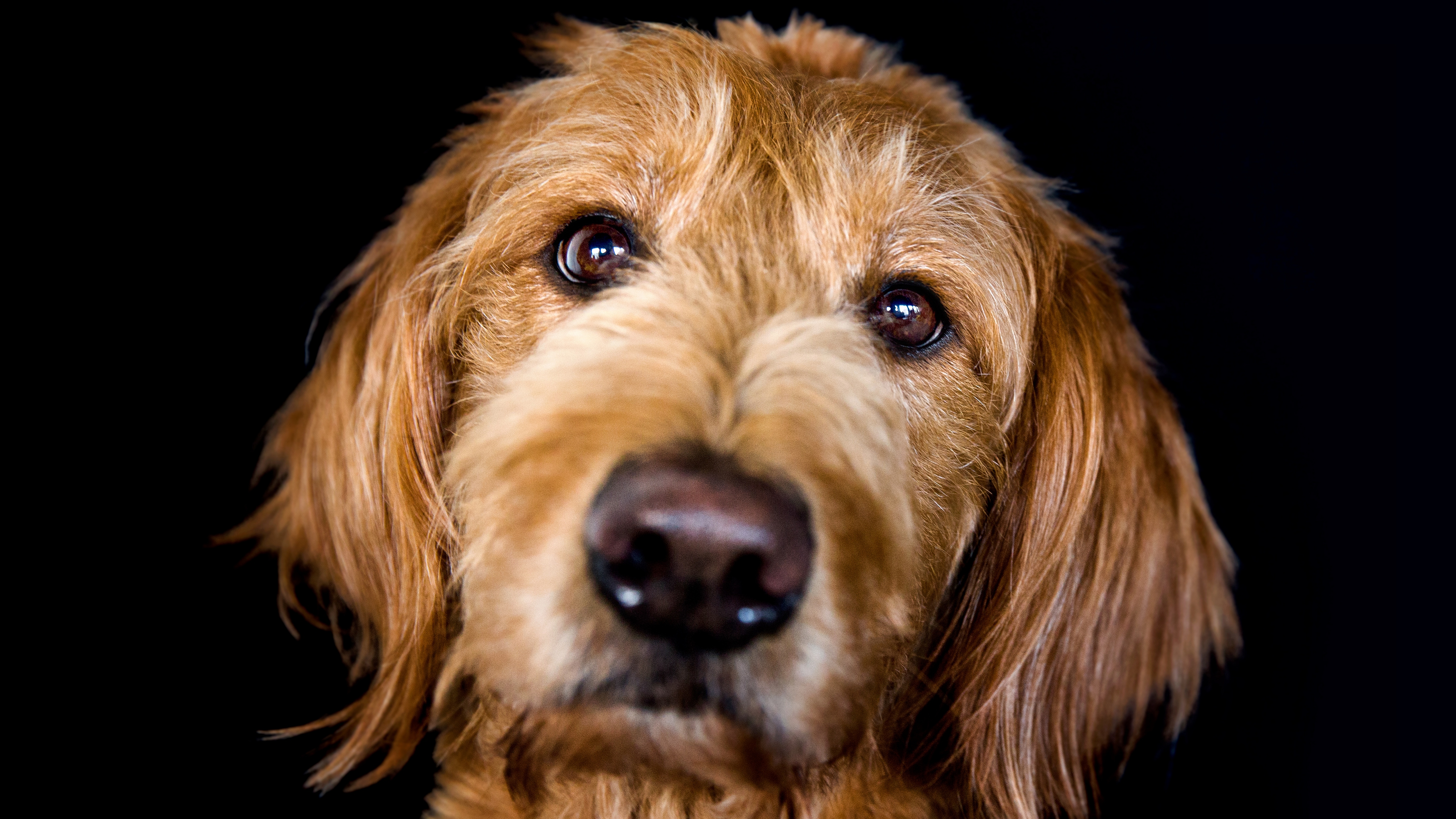 Description: A close up of a dog's face with a black background behind it and a black background behind it.