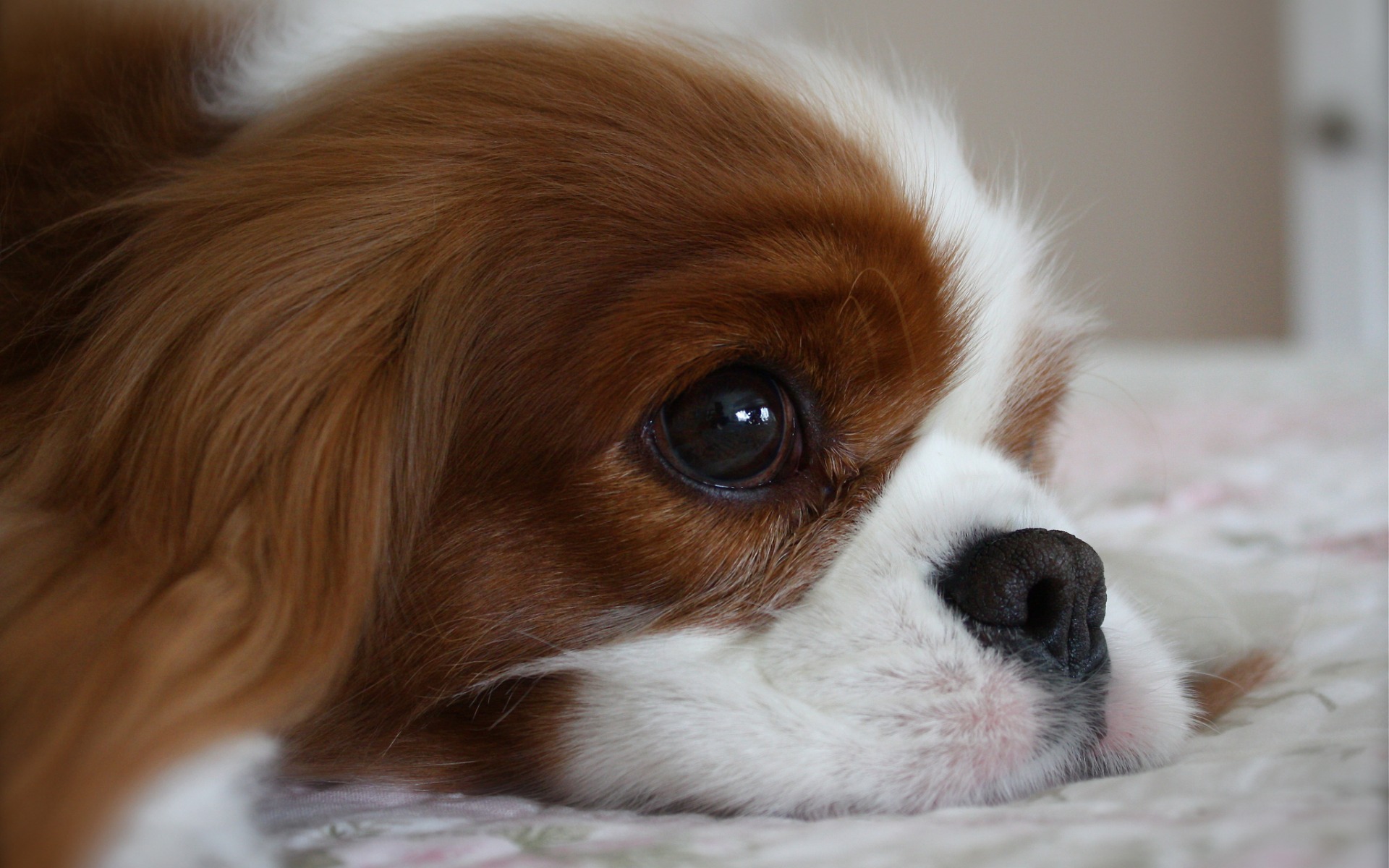 Description: A close up of a dog laying on a bed with a white and brown dog behind it and a black nose.