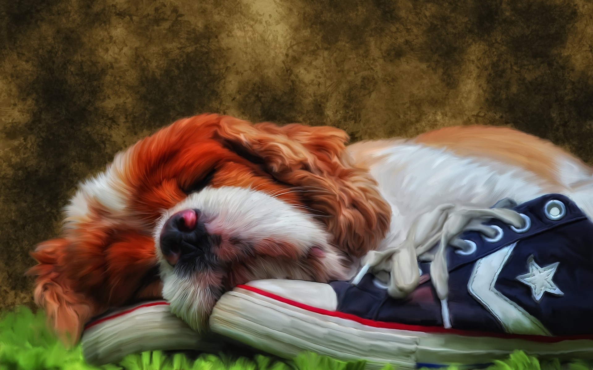 Description: A dog sleeping on top of a shoe on the grass with his head on the shoe's side.