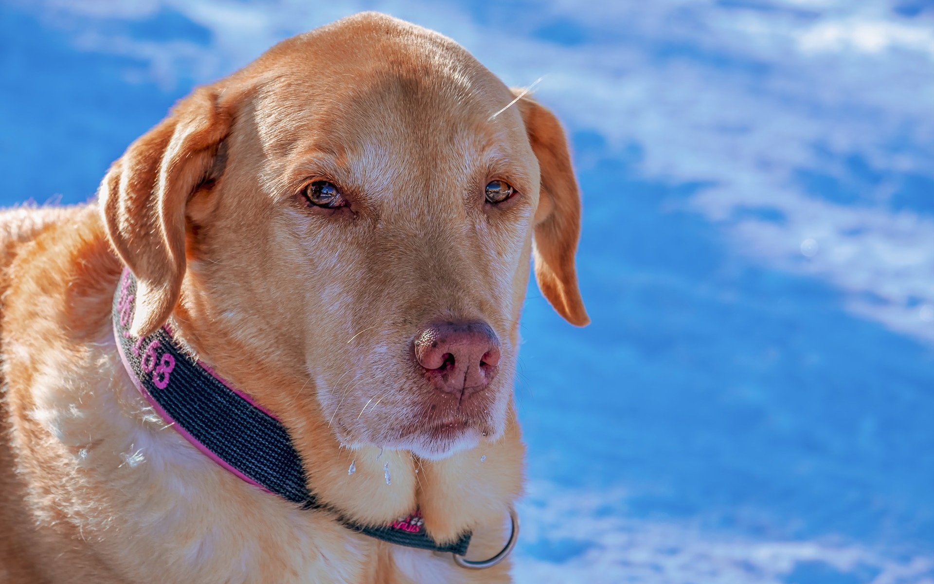 Description: A dog with a collar on standing in the snow looking at the camera with a smile on his face.