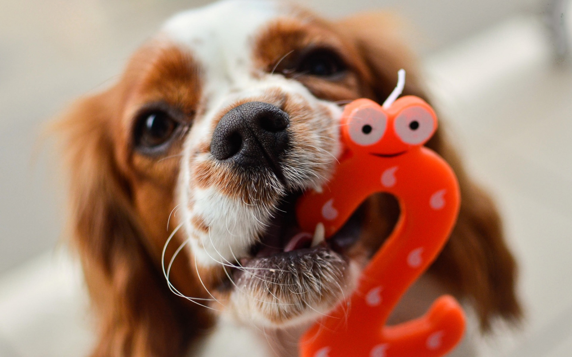 Description: A dog holding a toy in its mouth with a smiling face on it's face and a worm in its mouth.