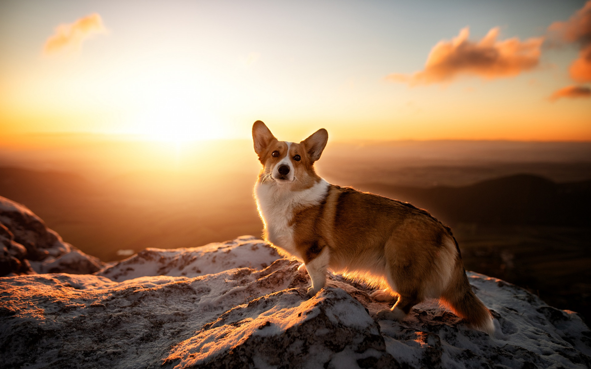 Description: A dog standing on top of a snow covered mountain at sunset or dawn with the sun setting behind him.