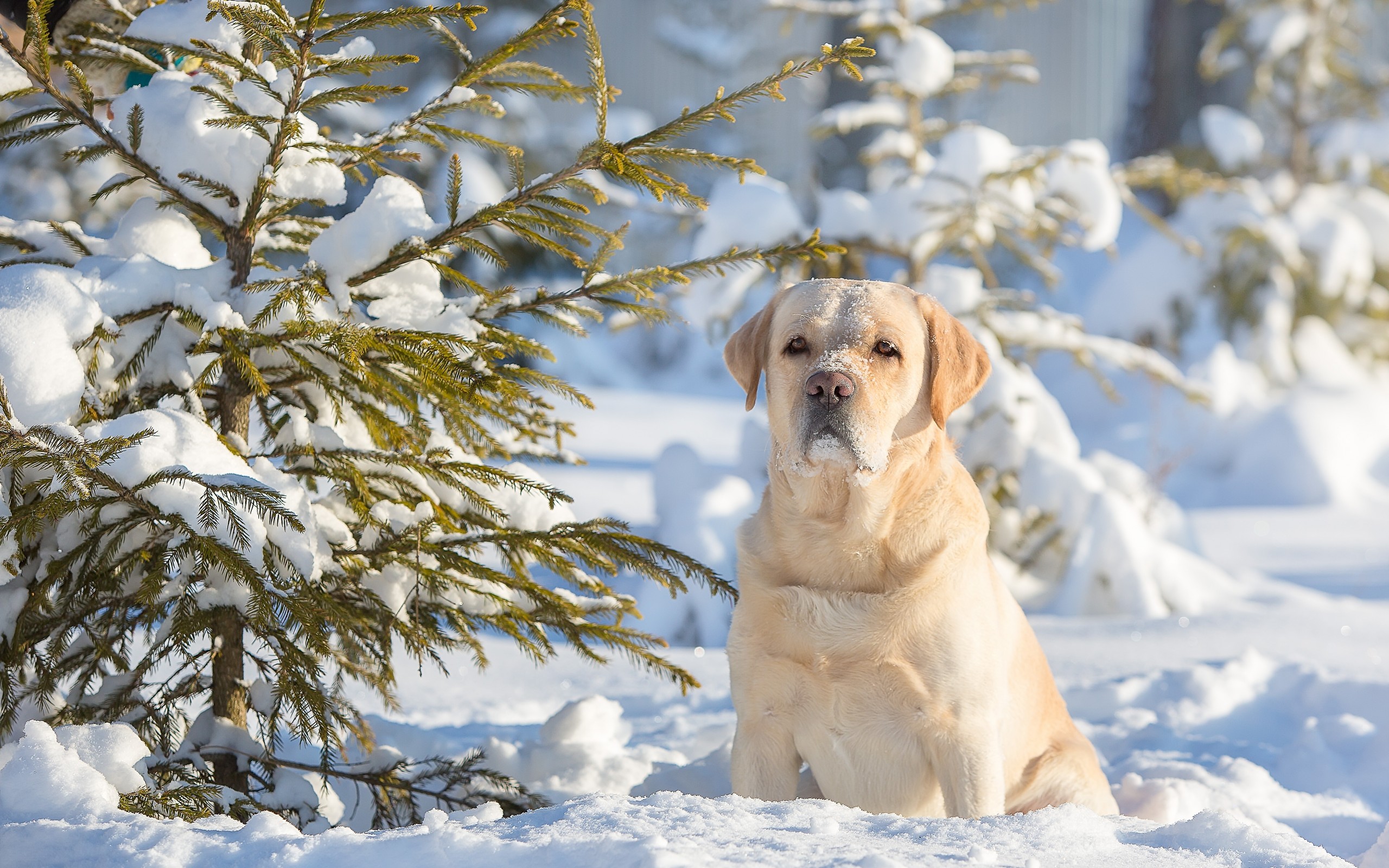 Description: A dog sitting in the snow next to a tree with snow on it's branches and snow on its face.