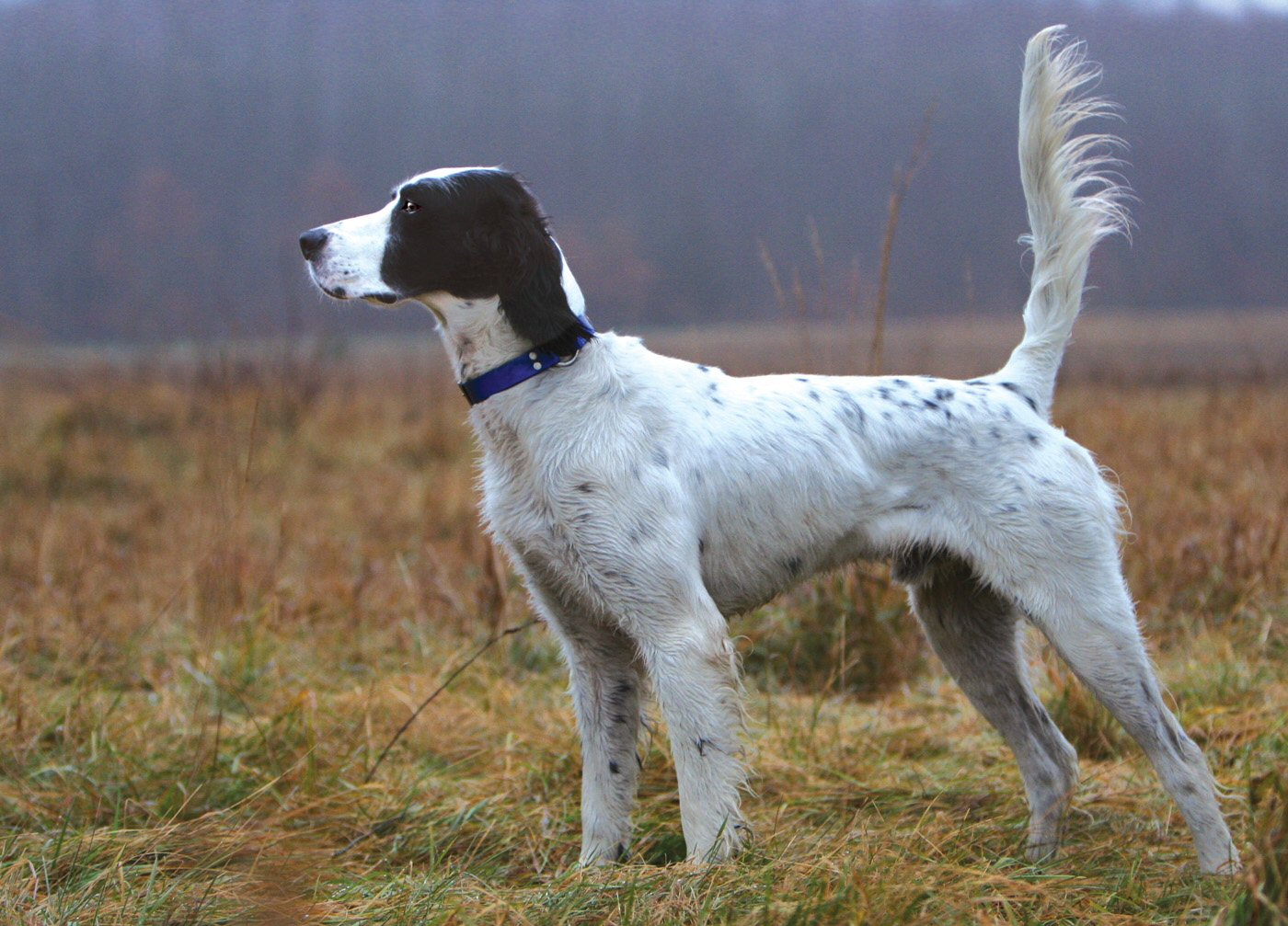 Description: A dog standing in a field with a blue collar on it's neck and a black and white dog on the other side.