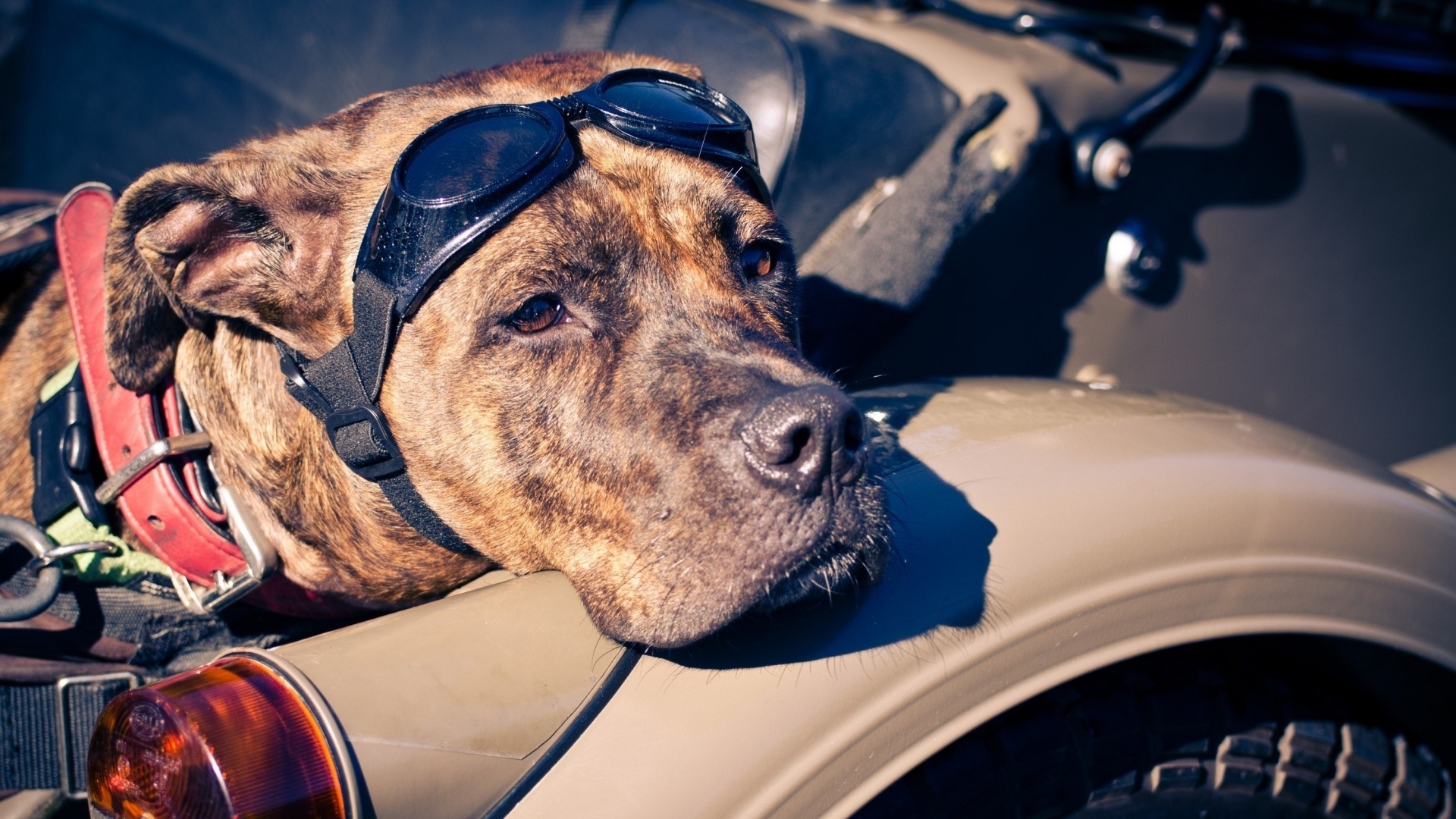 Description: A dog with sunglasses and a hat on is laying on a car's hood and looking at the camera.