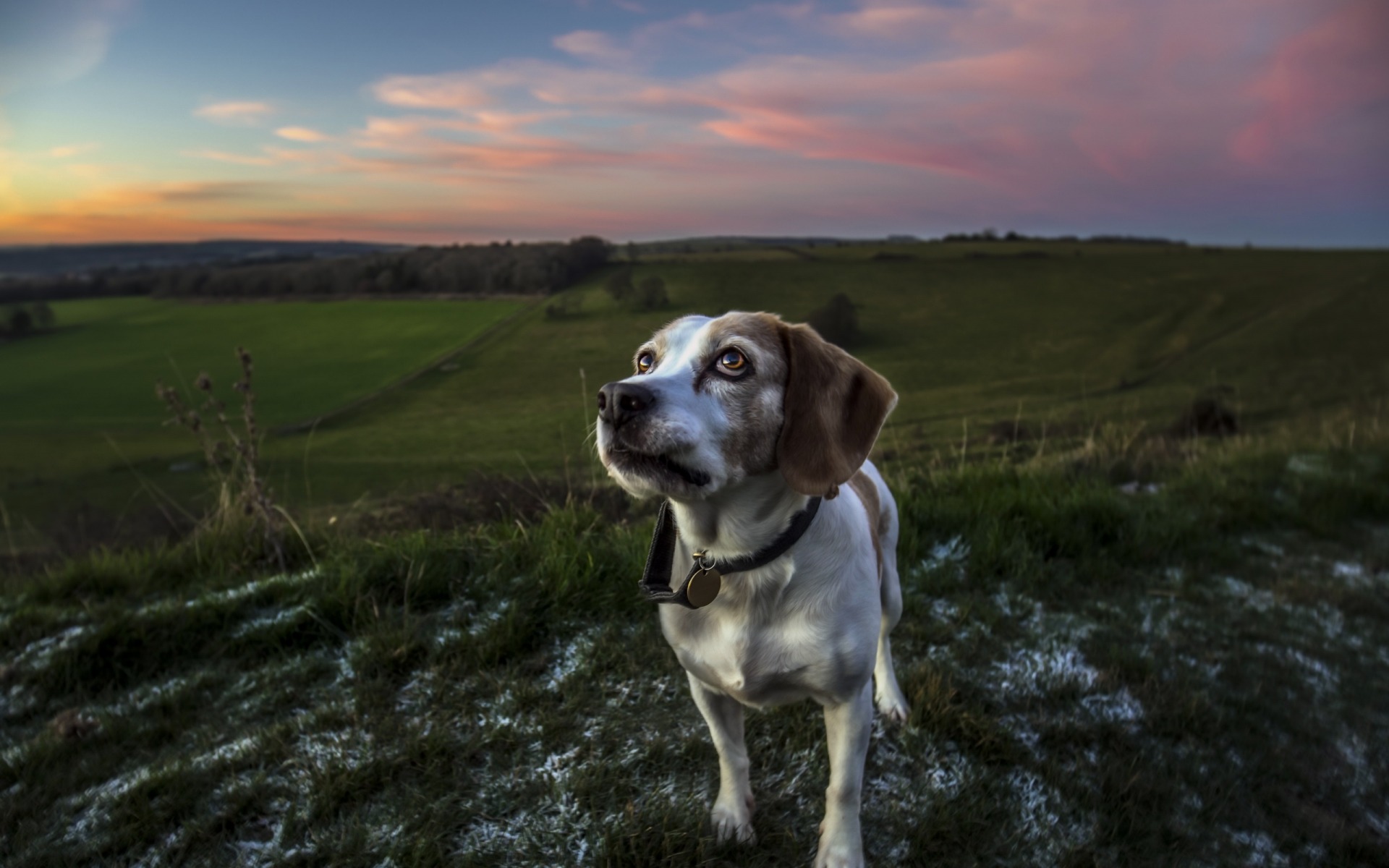 Description: A dog standing on a grassy hill at sunset with a pink sky in the background and a field of grass.