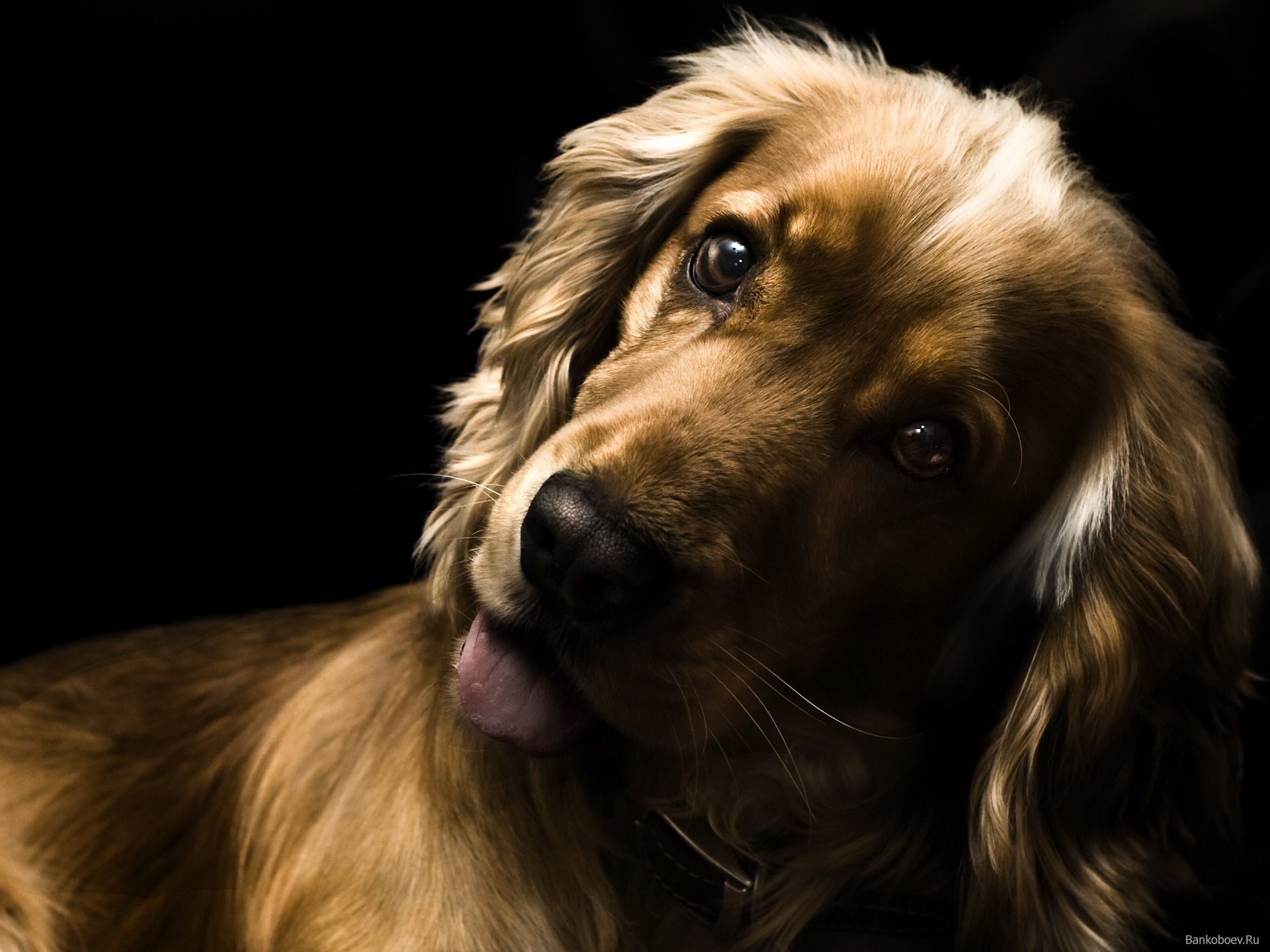 Description: A dog with its tongue out looking at the camera with a black background behind it and a black background behind it.