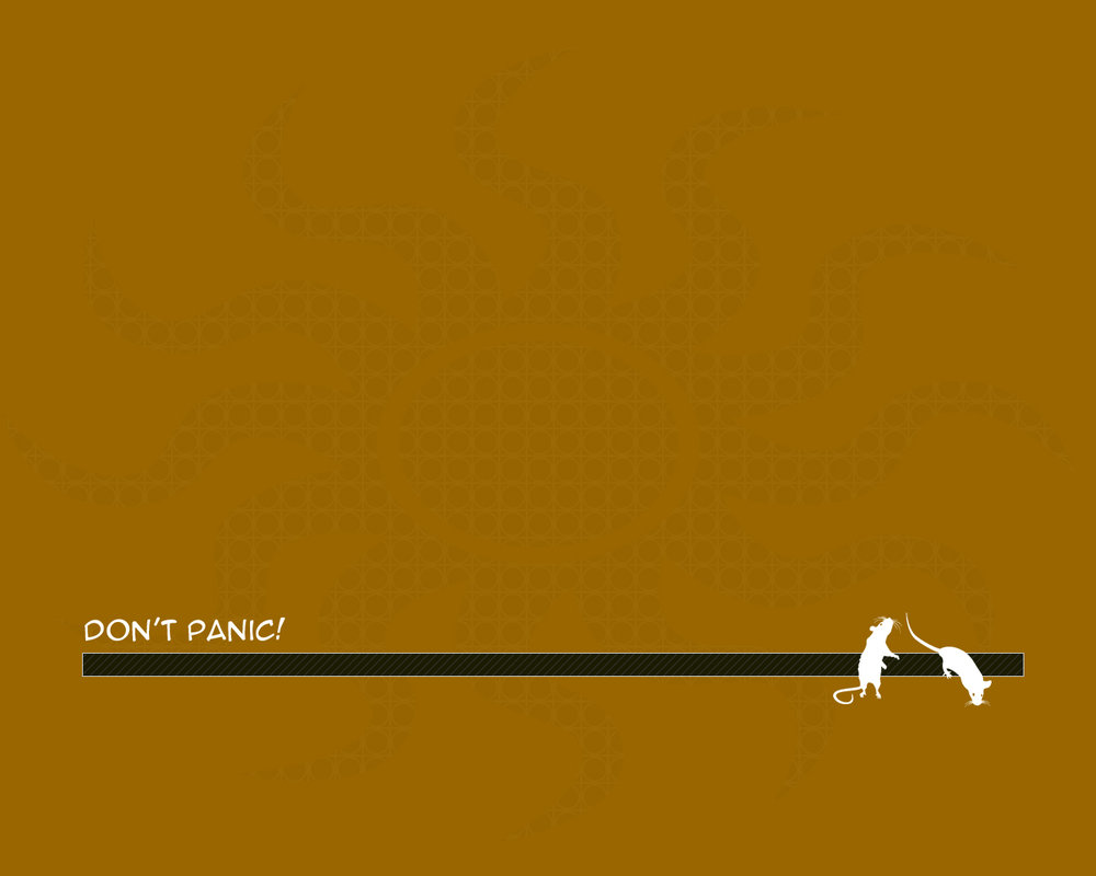 Description: A dog is walking on a long line with a caption that reads don't panic? on it.