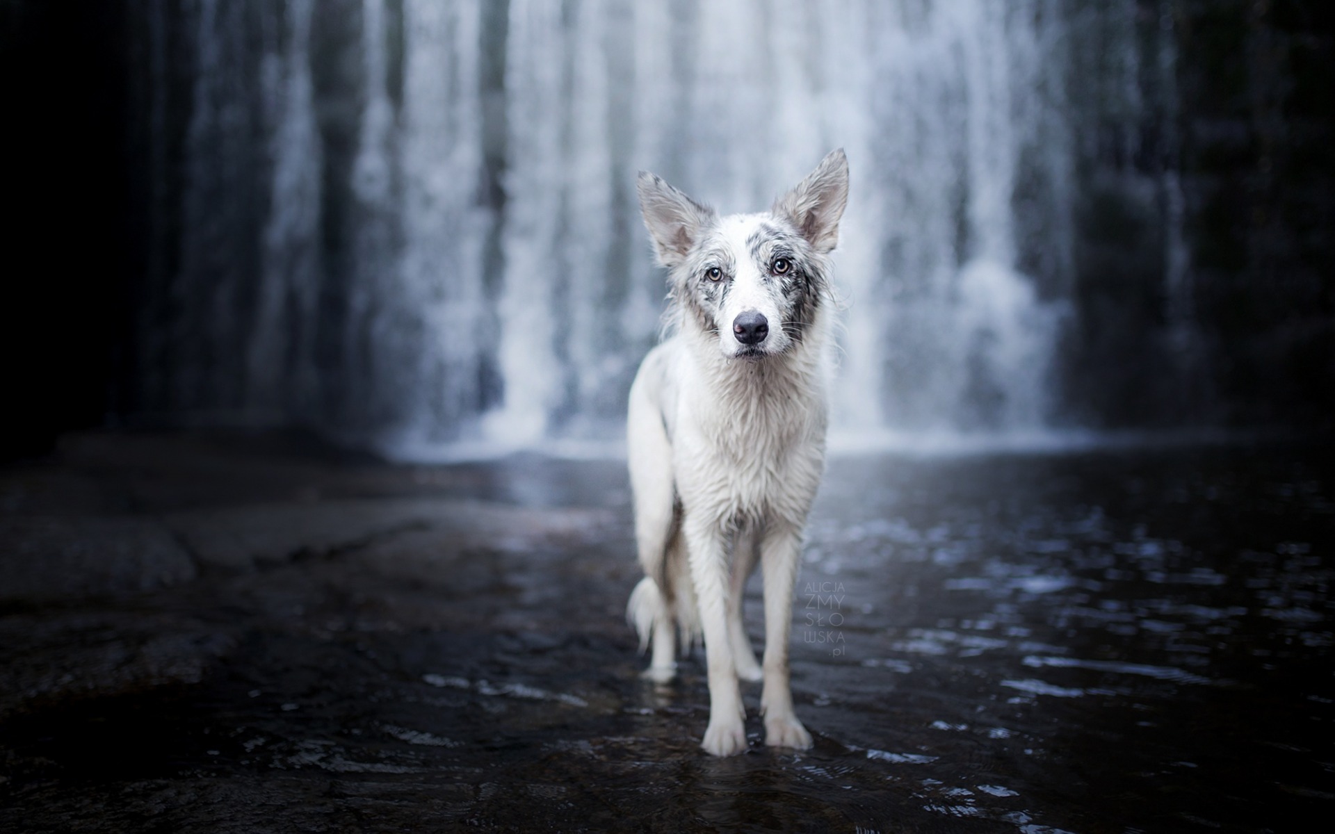 Description: A dog standing in front of a waterfall with water falling down it's face and a black background.