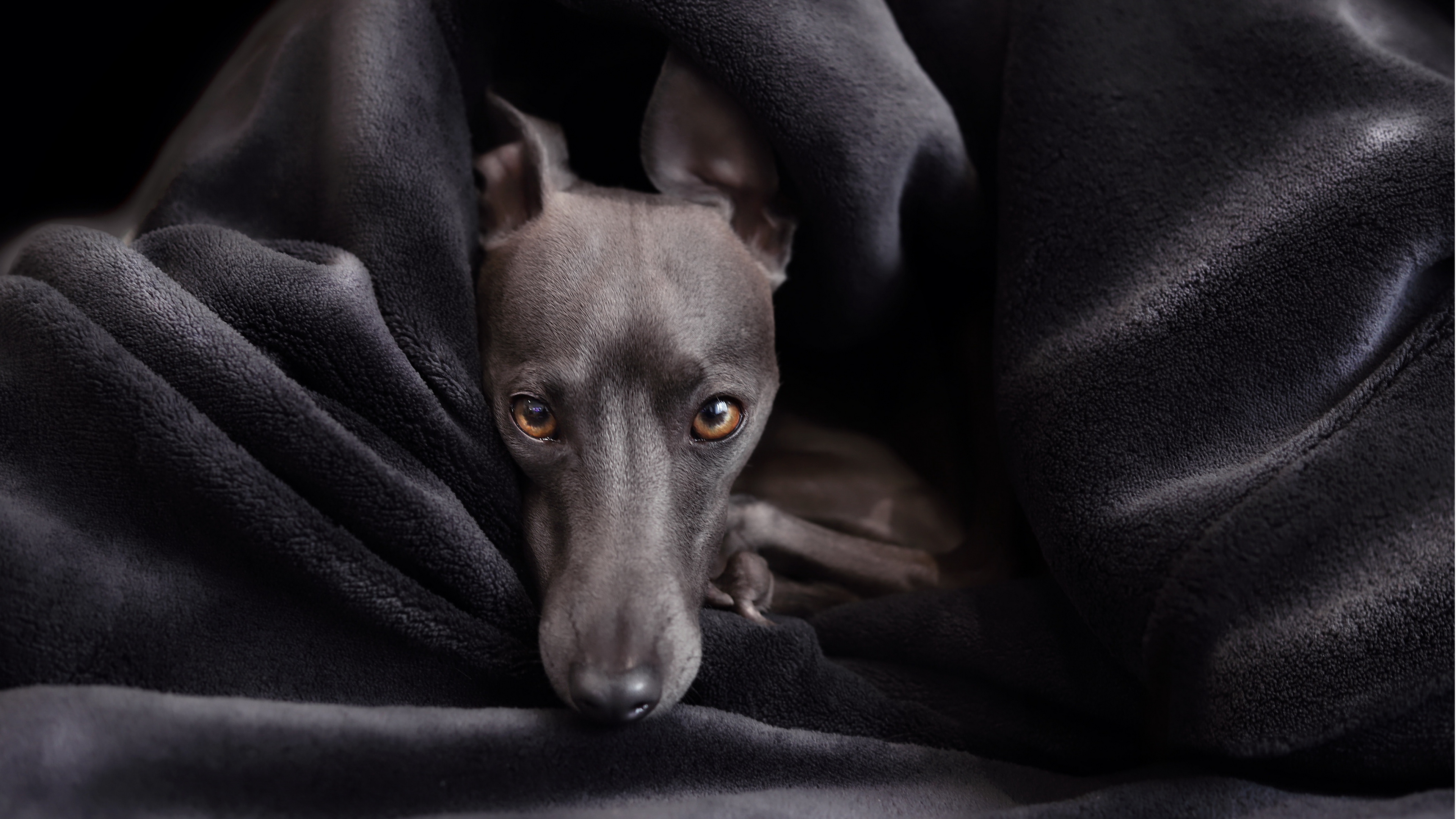 Description: A dog is wrapped up in a blanket and staring at the camera with a sad look on his face.