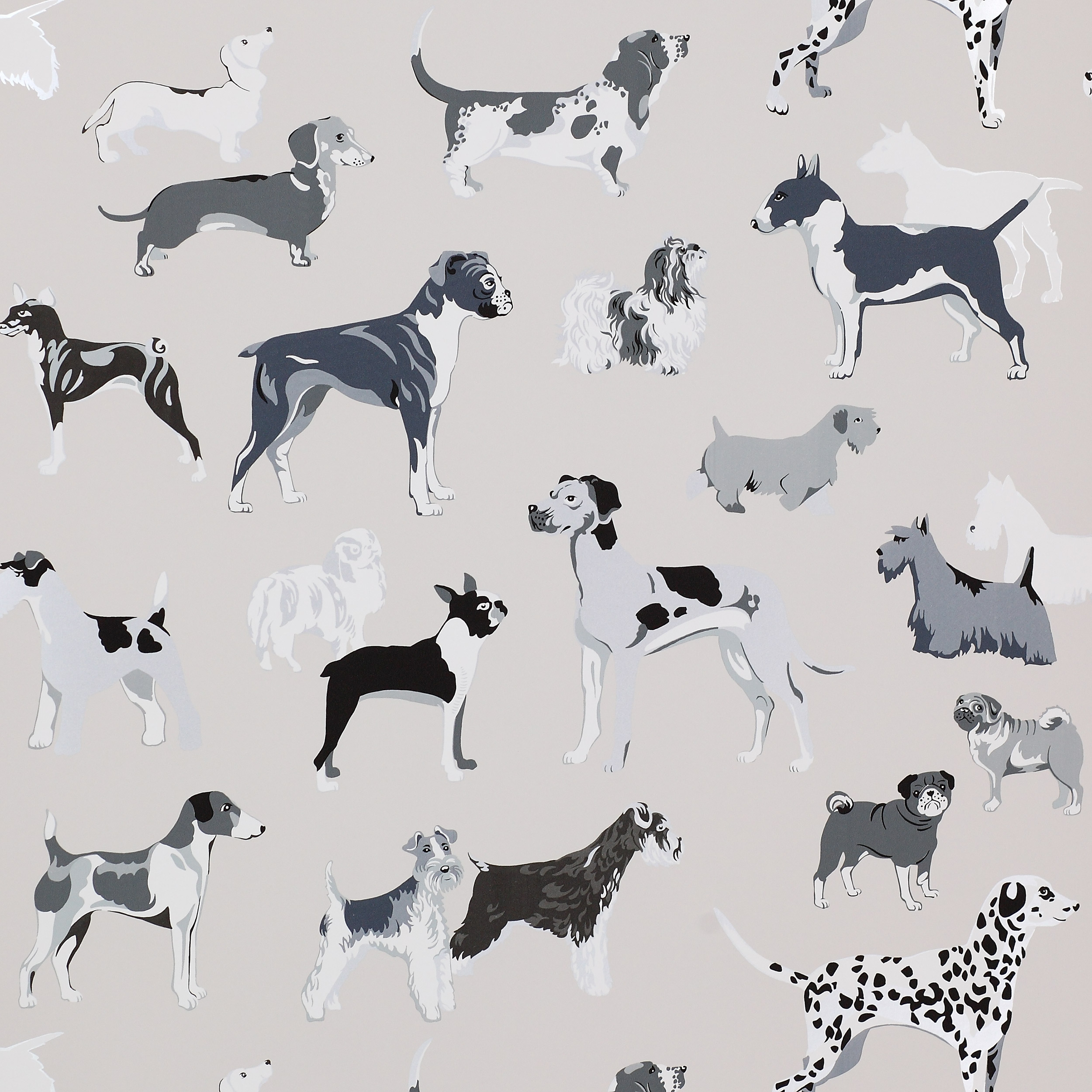 Description: A group of dogs that are standing in the grass together on a wallpaper background with a dog pattern.