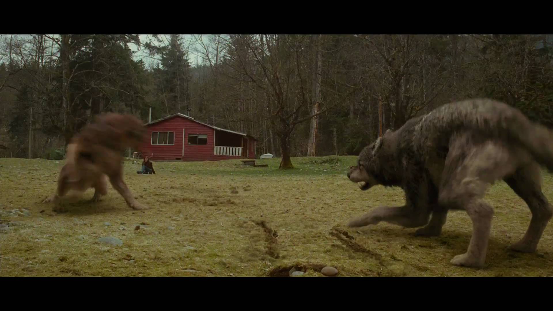 Description: Two dogs are playing in a field with a red house in the background and a person sitting on a bench.