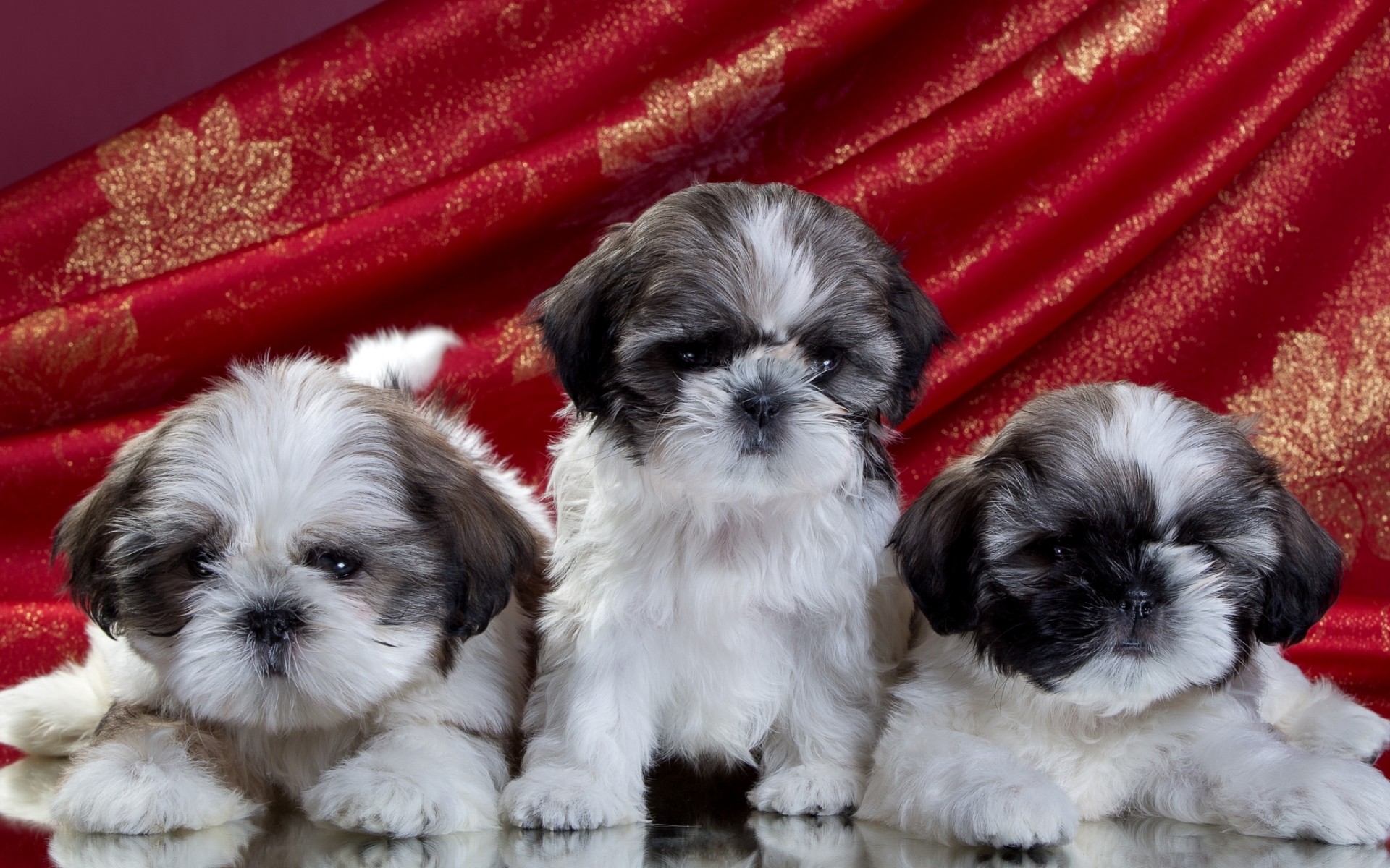 Description: Three small dogs are sitting on a table together.