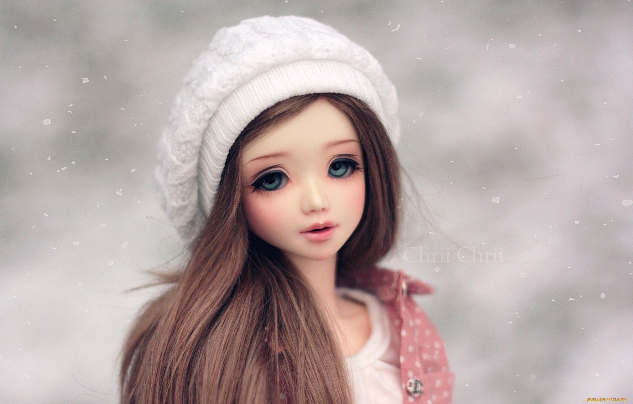 Description: A doll with long brown hair wearing a white hat and jacket with a polka dot shirt on it's chest.