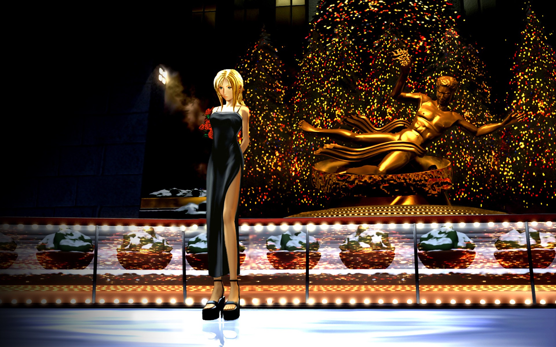 Description: A doll is standing in front of a christmas tree and a lit up display of lights and decorations on a wall.