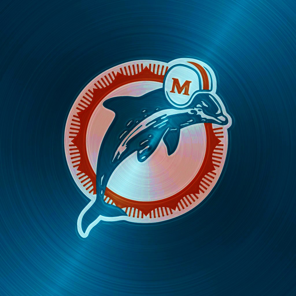 Description: A dolphin jumping out of the water with a circle around it's head and a letter m on it.