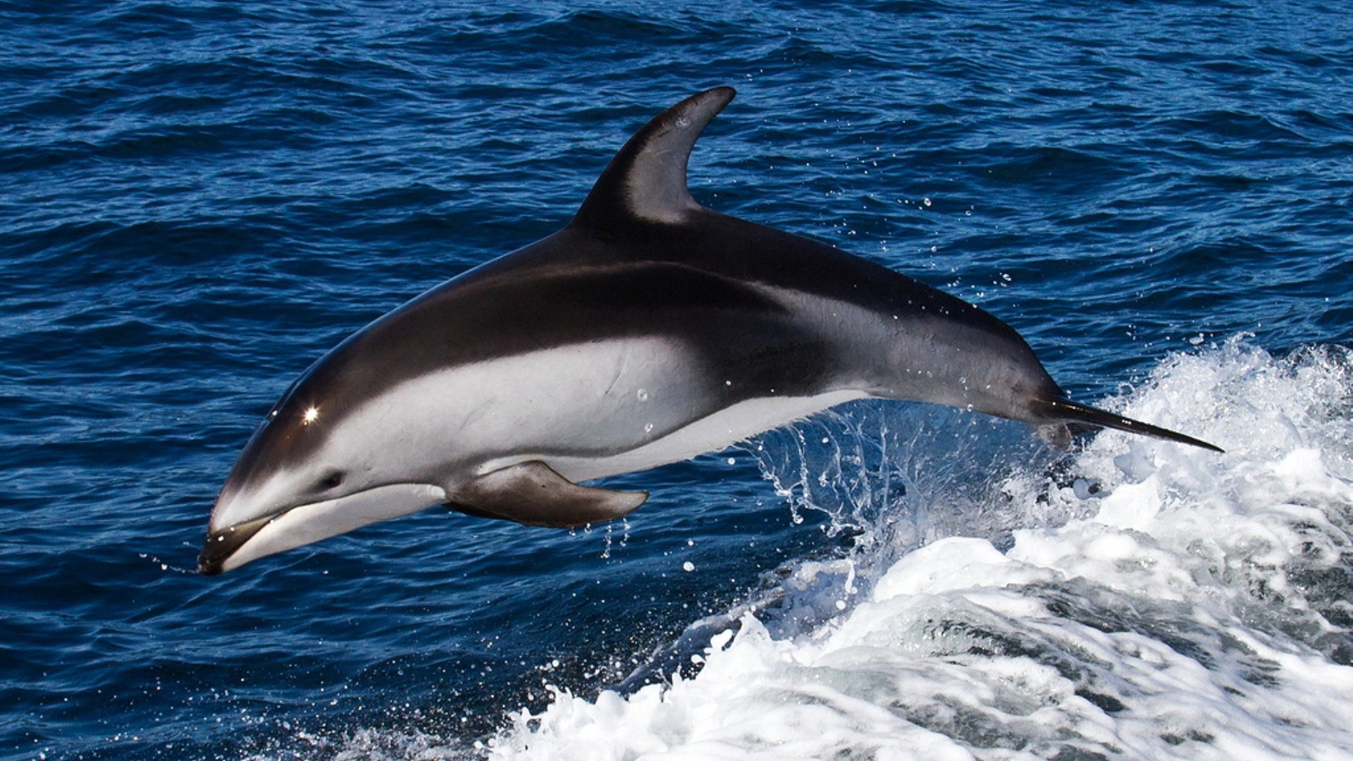 Description: A dolphin jumping out of the water with its mouth open and it's mouth wide open.