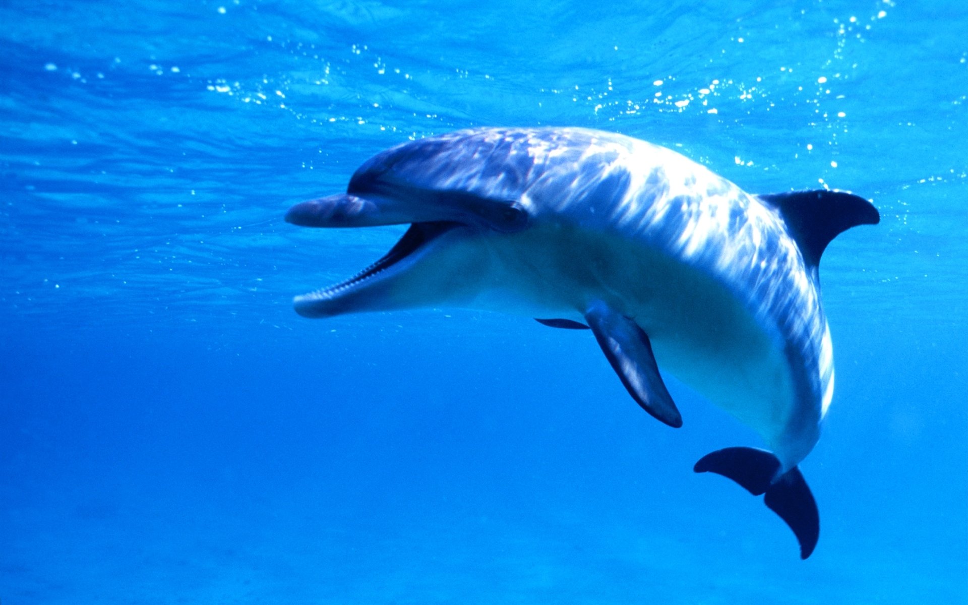 Description: A dolphin swimming in the ocean with its mouth open and its mouth wide open to the camera.
