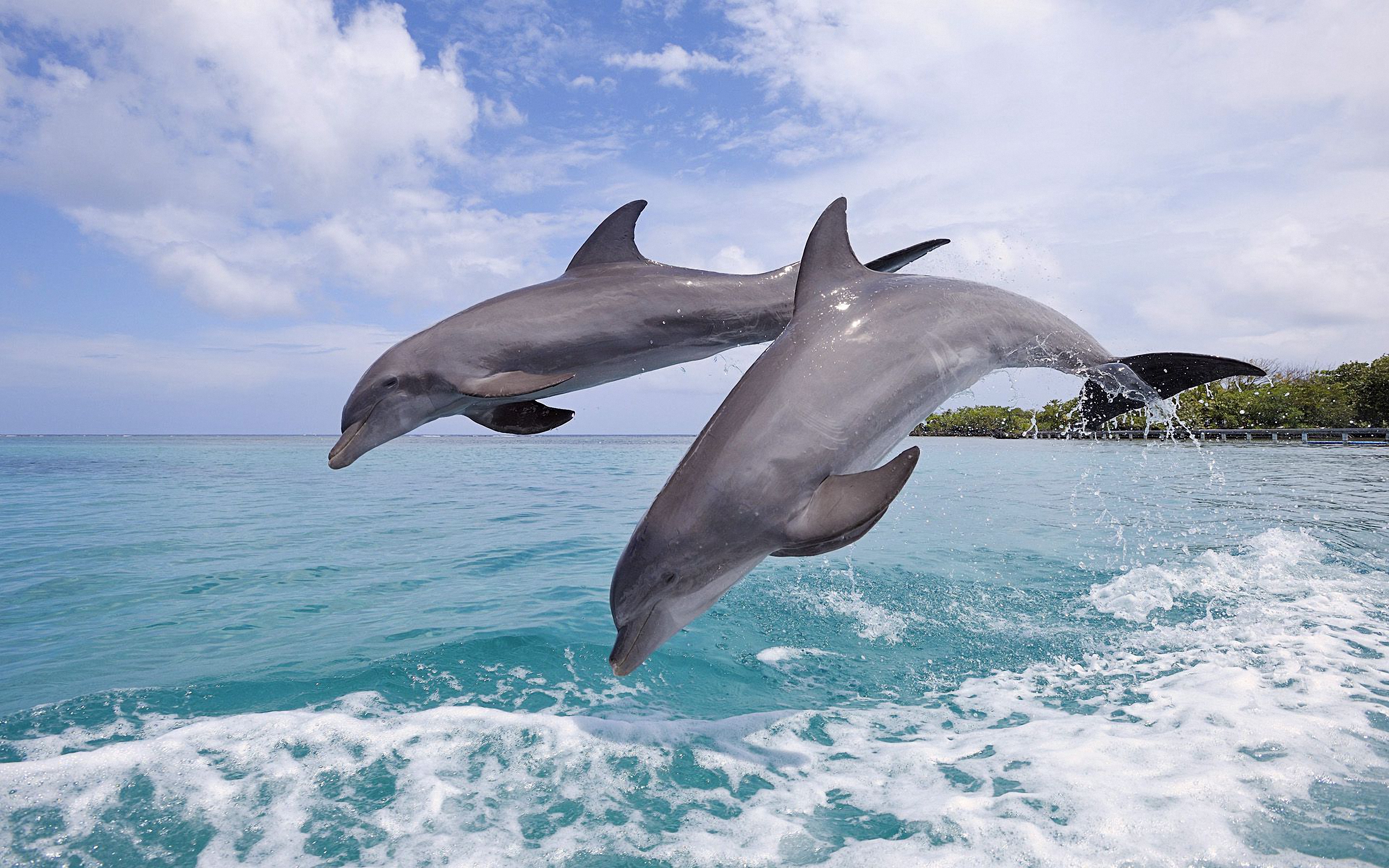 Description: Two dolphins jumping out of the water near a shore line with a tree in the background and a blue sky with clouds.
