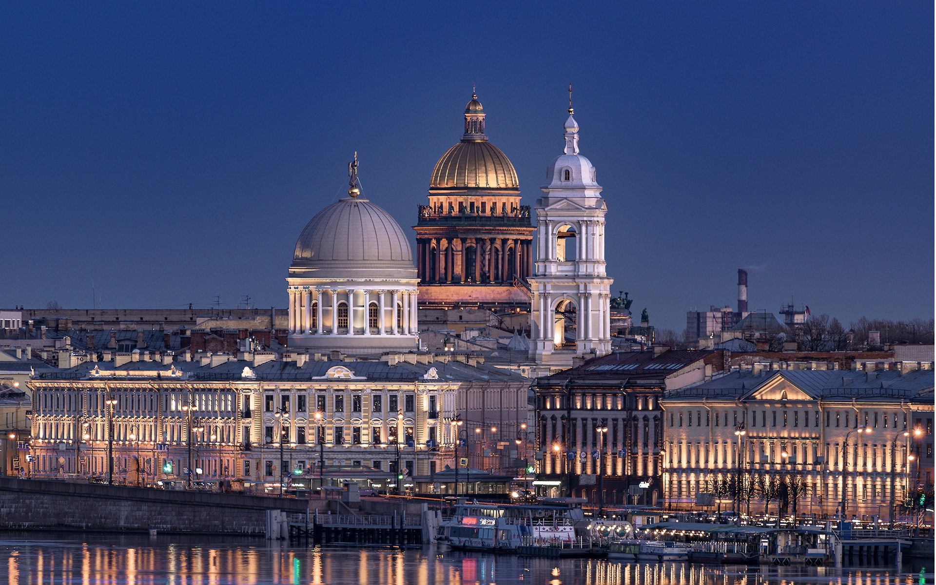 Description: A large building with a dome on top of it next to a body of water with boats in it.
