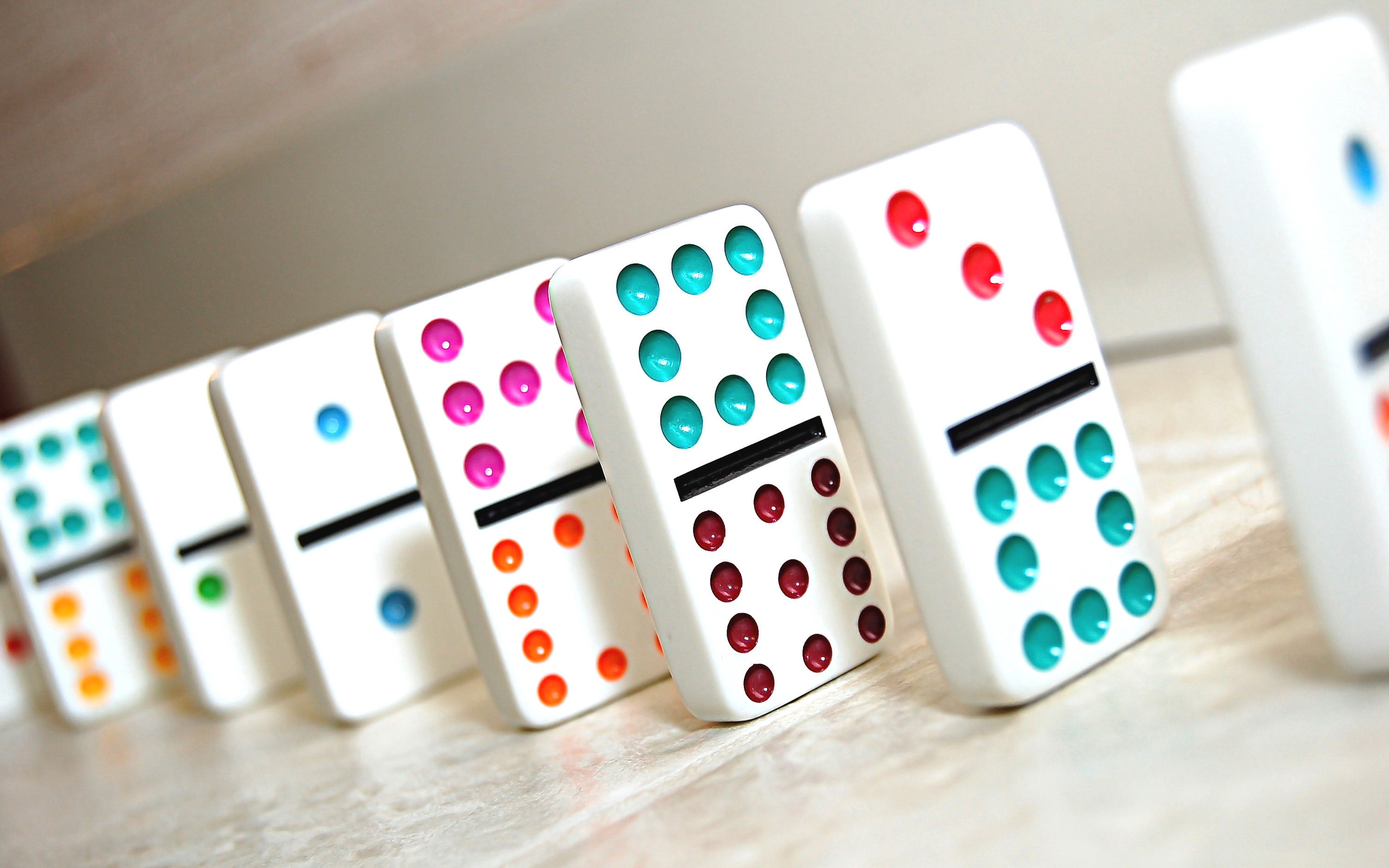 Description: A row of dominos sitting on top of a table next to each other on top of a table.