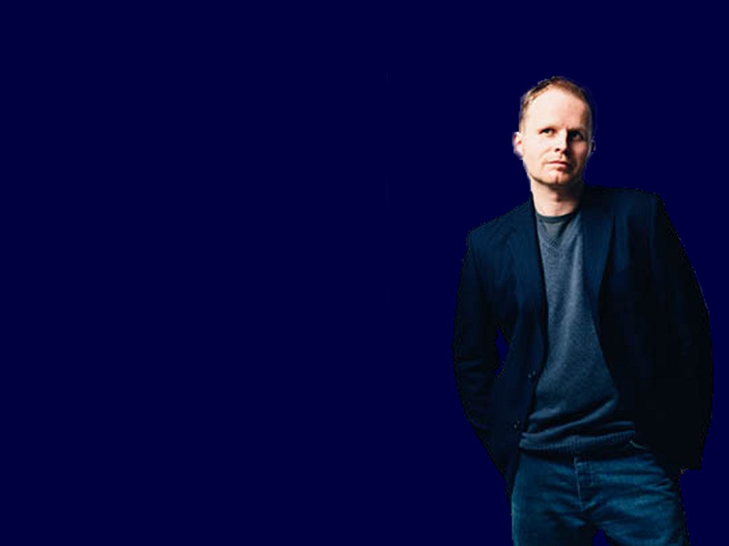 Description: A man in a black jacket and jeans standing in front of a blue background with his hands in his pockets.