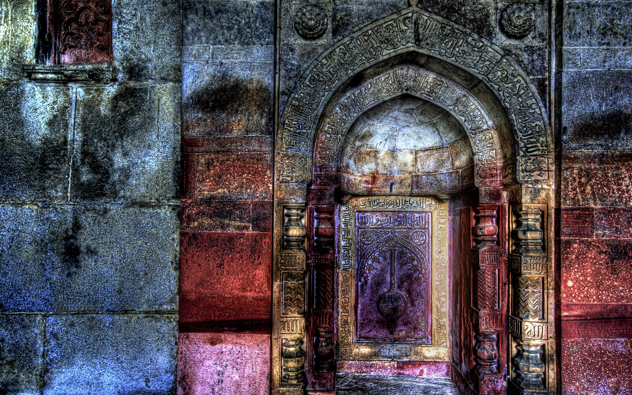 Description: A doorway with a door in a stone building with a red and blue wall behind it and a doorway with a door in the middle.