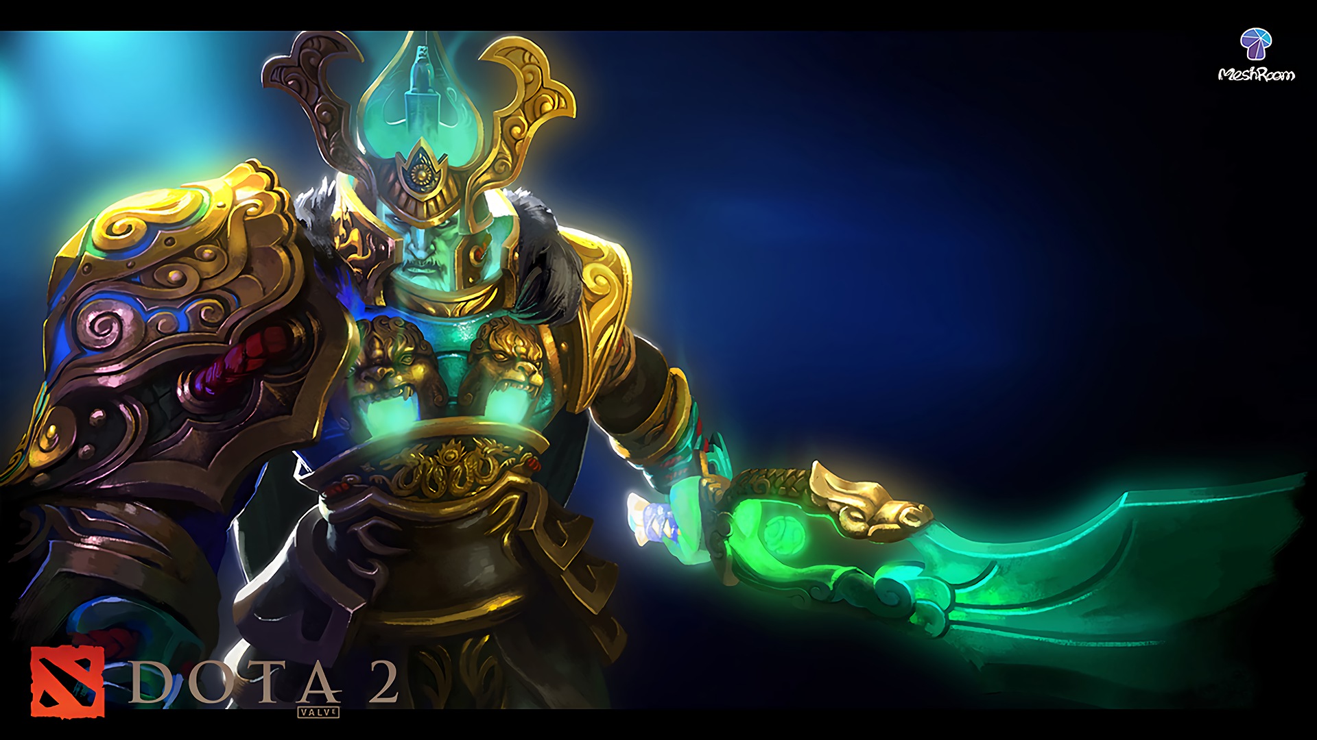 Description: A character from dota 2 holding a green light sword and a green light sword in his hand.