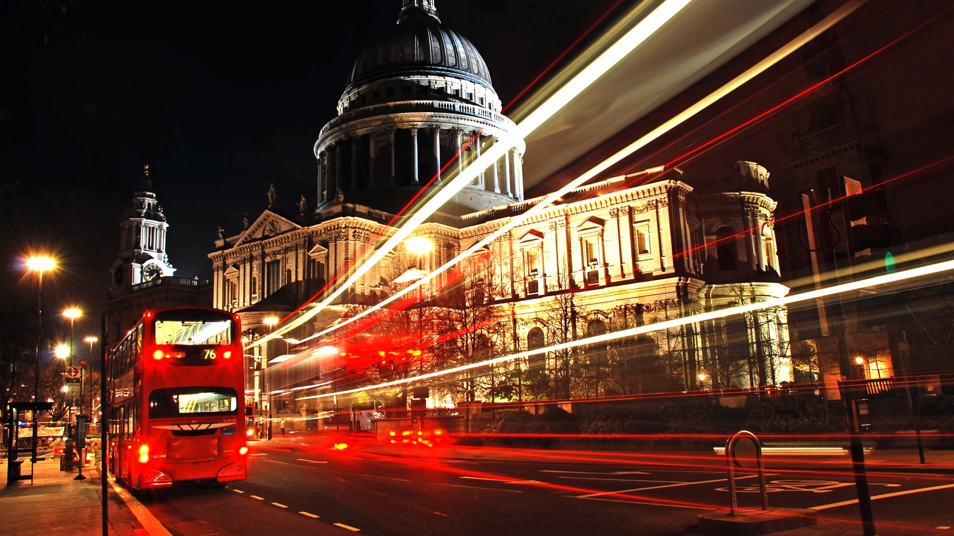 Description: A double decker bus driving down a street at night time with a building in the background and lights streaking across the street.