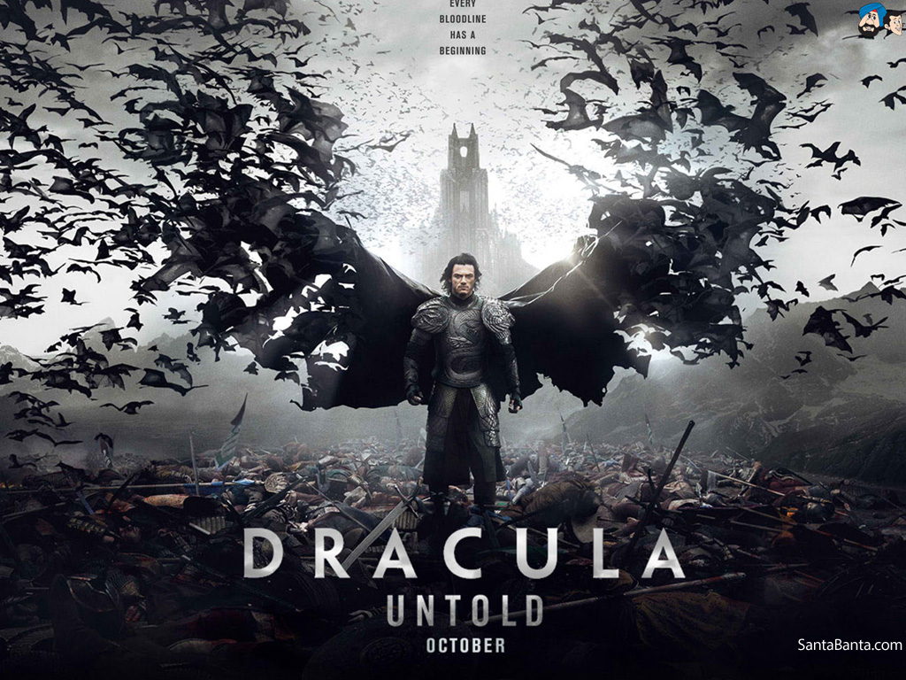 Description: Dracula unto is a movie with a huge amount of bats flying over it and a man standing in front of a large crowd.