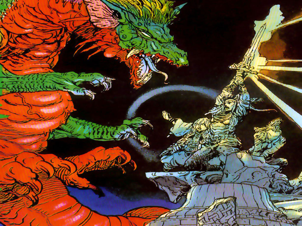 Description: A drawing of a dragon attacking a demon on a rock formation with a man on a horse in the background.