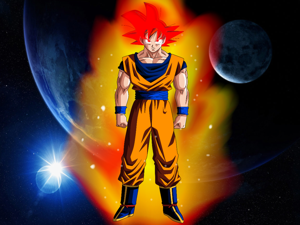 Description: A dragon ball character standing in front of a planet with a blue sky and stars in the background and a red and yellow flame.