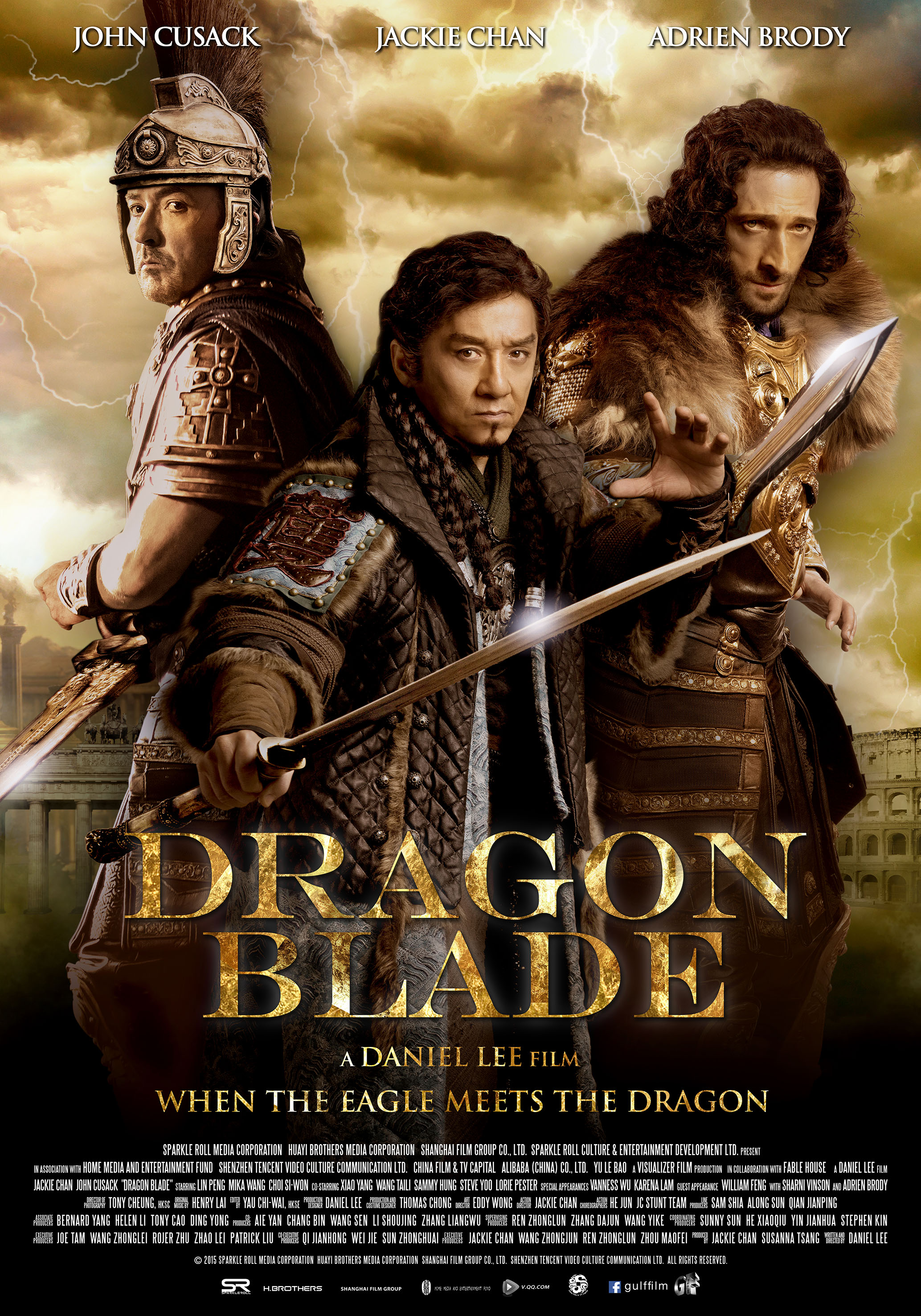 Description: A movie poster for the film dragon blade with two men in armor and one man holding a sword and a cat.