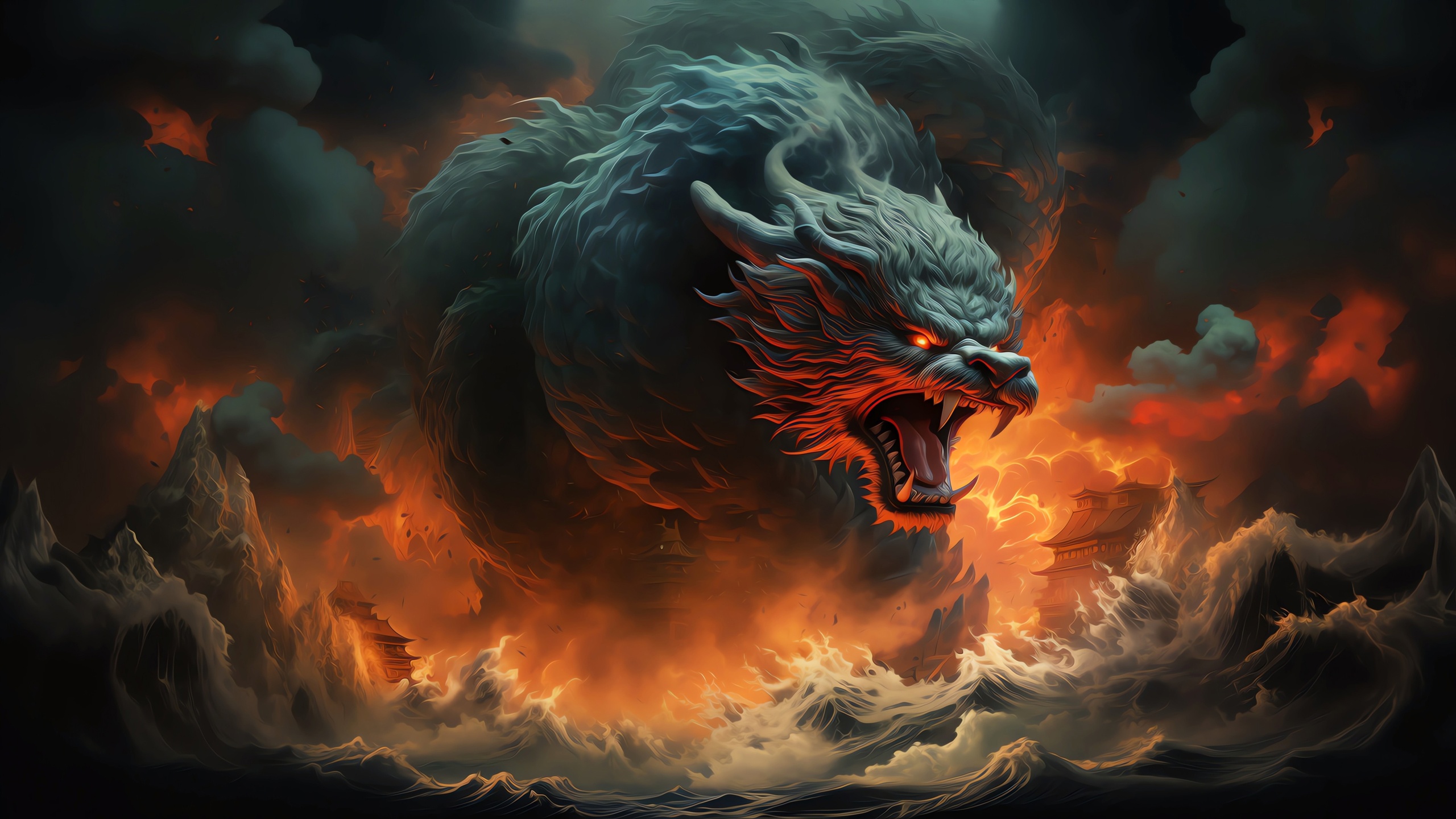 Description: A dragon with a red eyes and a black face is in the midst of a fire and water scene.