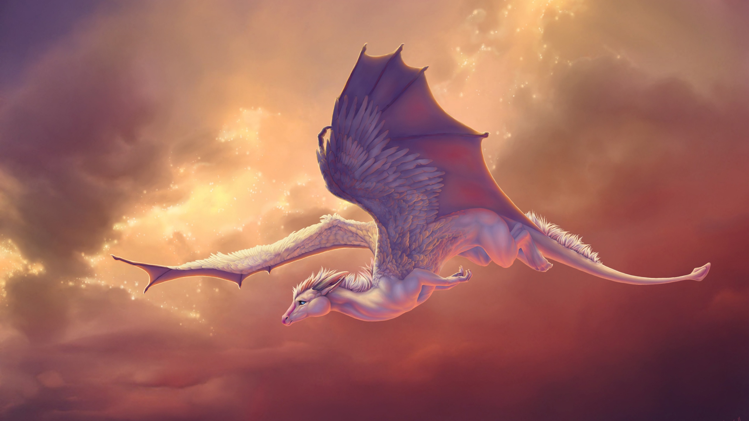 Description: A painting of a dragon flying through the sky with clouds in the background and a dragon in the foreground.