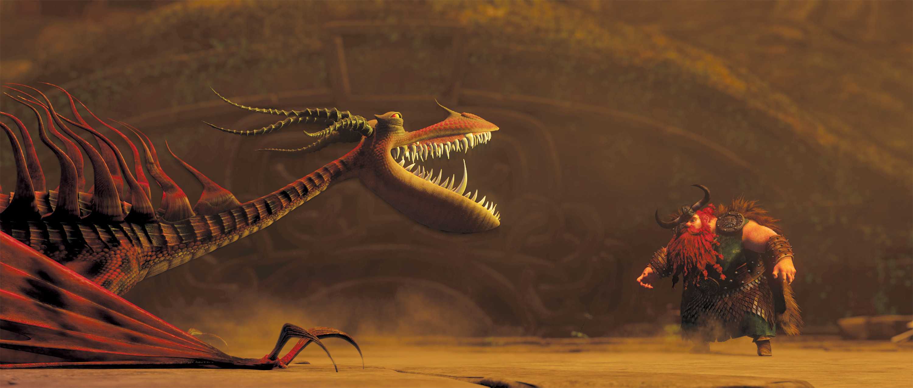Description: A man in a costume is walking next to a dragon with a long tongue and a large mouth with sharp teeth.