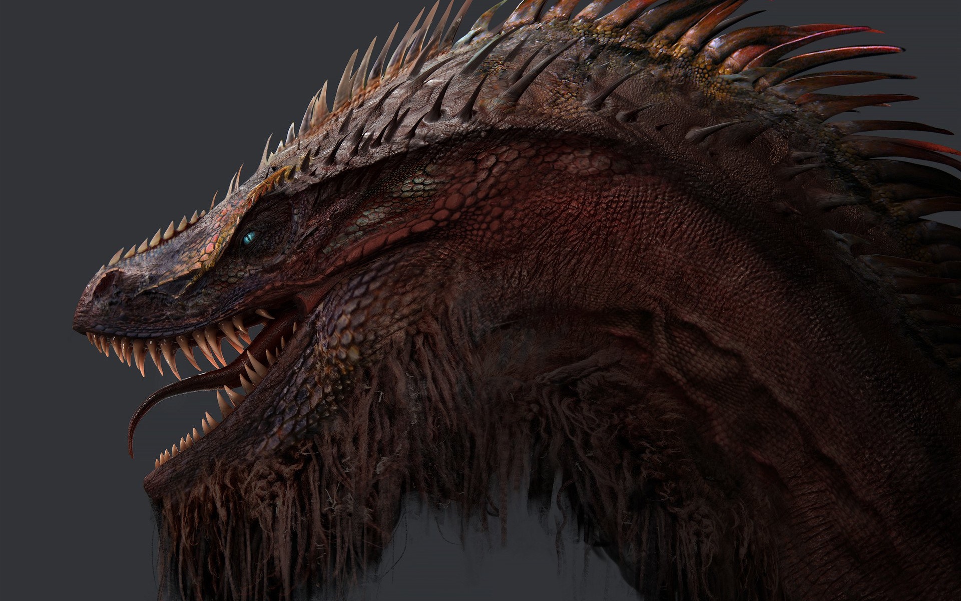 Description: A close up of a dragon head with spikes on it's head and a black background with a gray background.