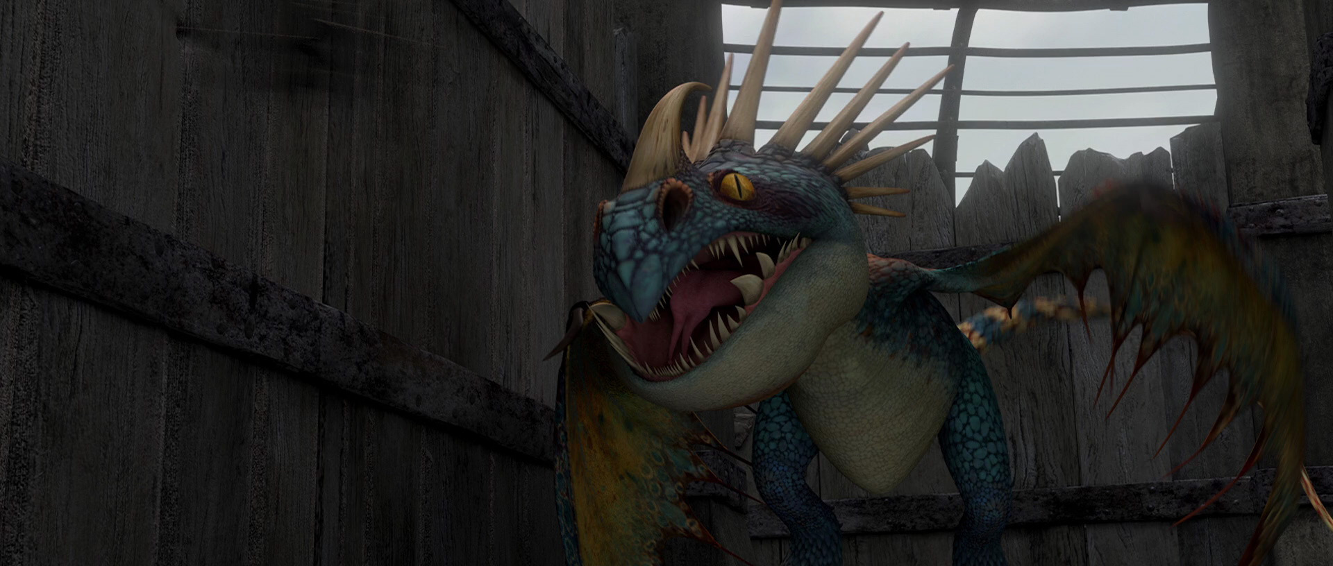 Description: A dragon with large teeth and sharp teeth standing in a wooden building with a window behind it and a wooden fence.