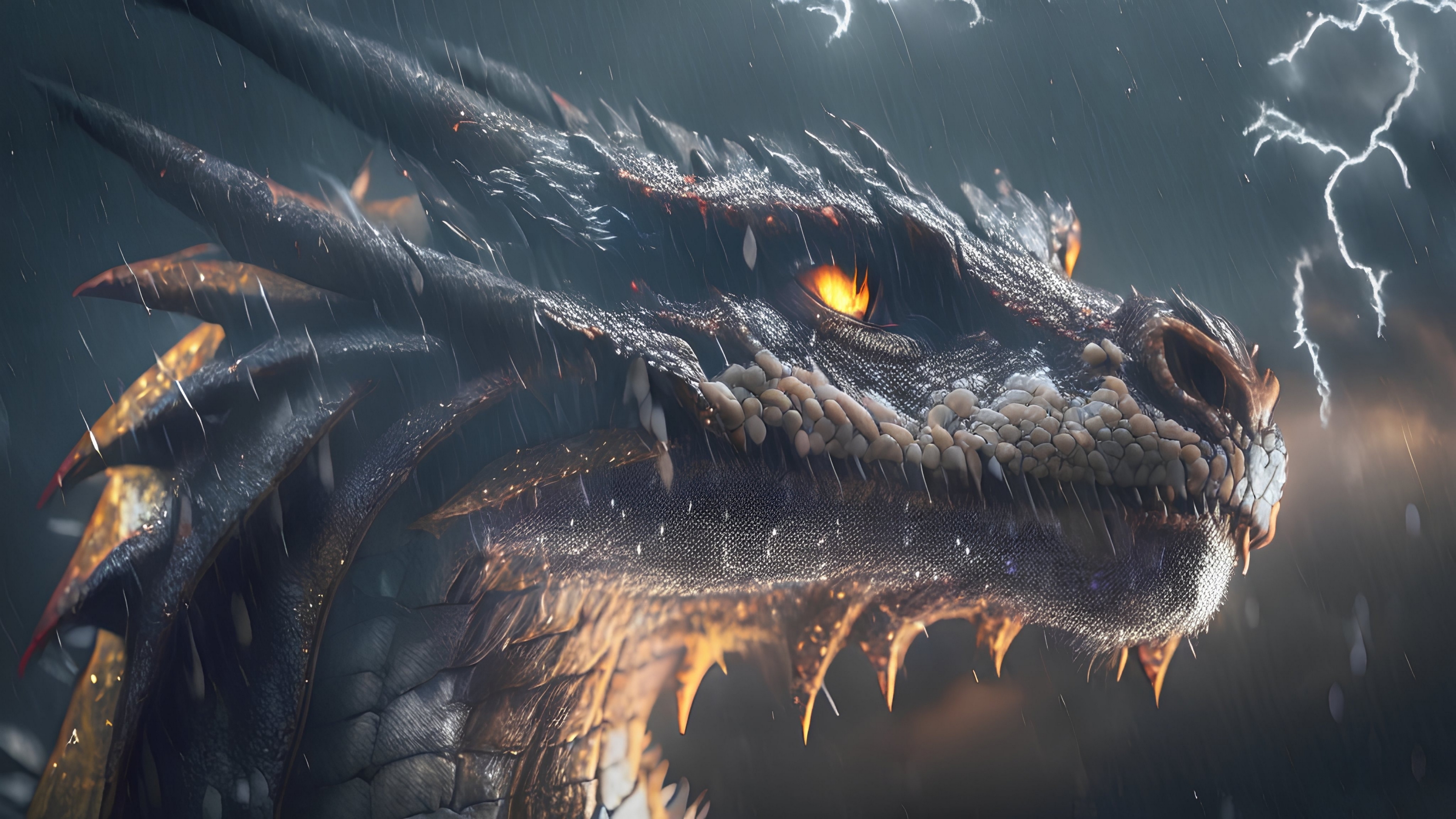 Description: A dragon with a lightning background in the rain with lightning coming from its head and eyes.