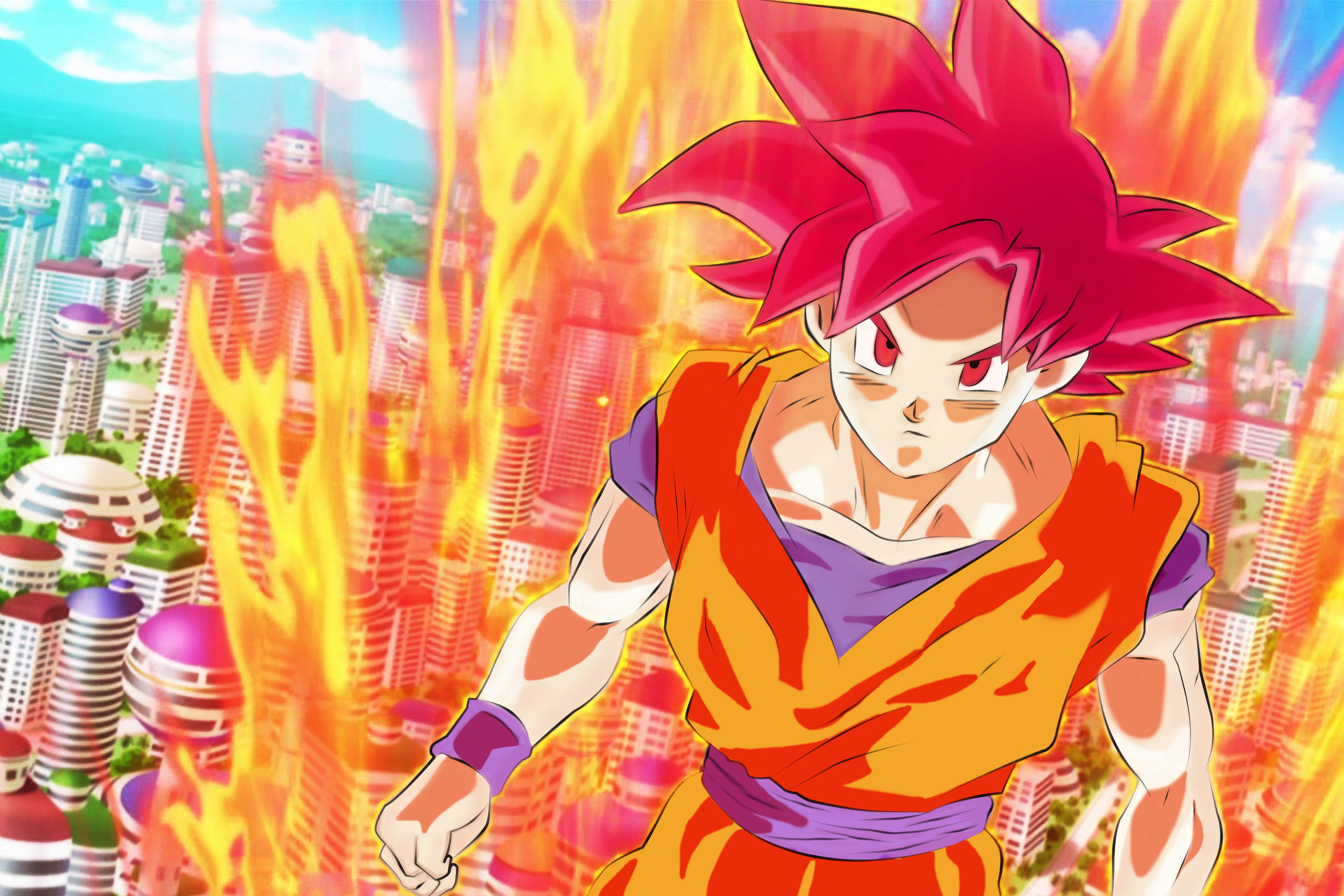 Description: A dragon in a red and yellow outfit is in front of a city with flames and buildings in the background.