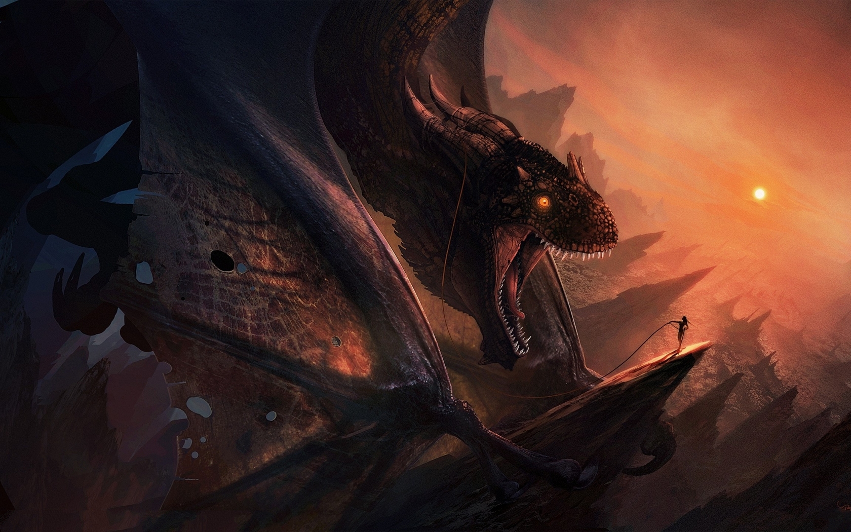 Description: A dragon with a sword in its mouth in a dark forest at sunset with a person standing on a cliff.