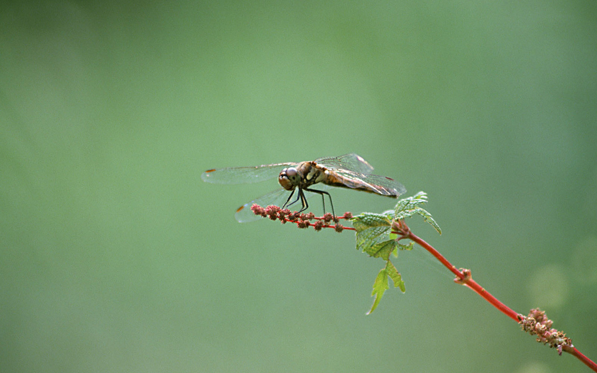 Description: A dragon fly sitting on a branch with a green background behind it and a red stem with a green stem.