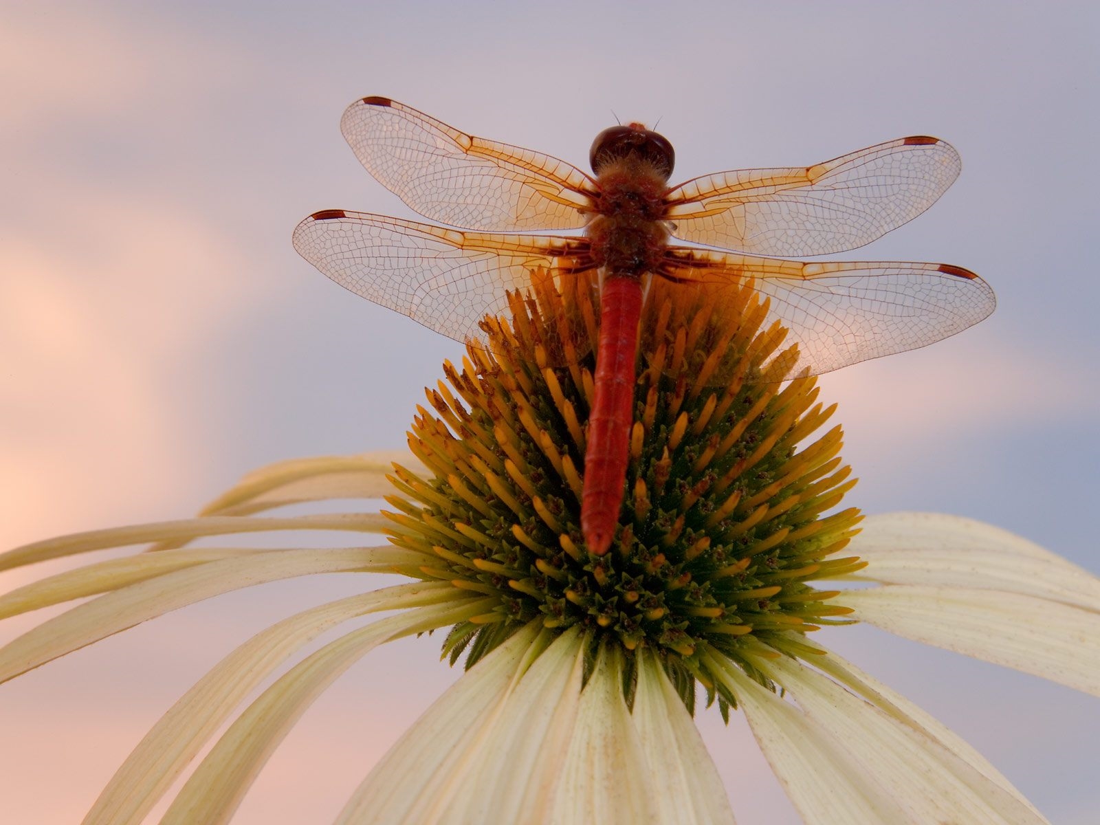 Description: A dragonfly sitting on top of a flower with a sky background behind it and a blue sky in the background.