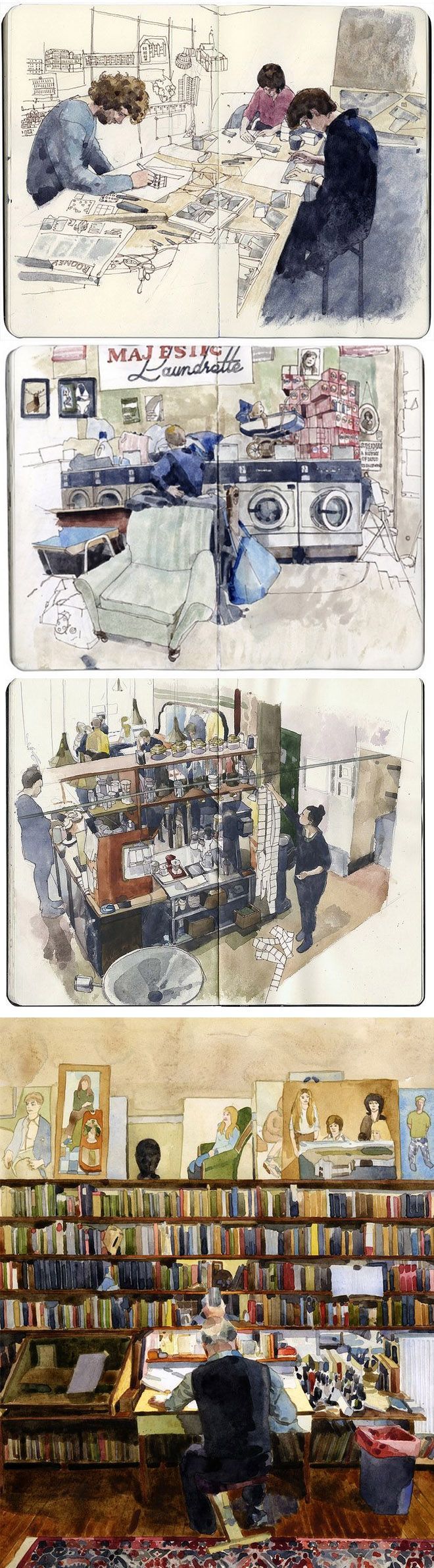 Description: A drawing of a room with a lot of books on the shelves and a couch in the middle of the room.